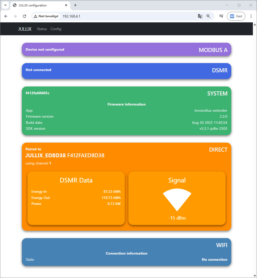 Je kan dit ook controleren op het dashboard van de Extender. In de Extender status zie je de verbinding naar de Jullix, en zie je ook het wifi netwerk waarmee geconnecteerd is.