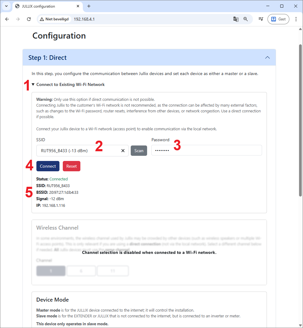 Je kiest bij Wireless channel (1) hetzelfde kanaal dat in de Jullix is ingesteld.