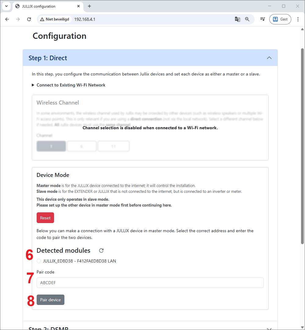 Via Step 1: Direct verbind je de Extender draadloos met de Jullix Master. Het apparaat - omvormer, laadpaal, digitalemeter, … - wordt op die manier draadloos verbonden met de Jullix gateway. Voordat je de Extender kan verbinden moet je dus zorgen dat je de paircode van de Jullix waarmee je wil verbinden bij de hand hebt. Als je de paircode hebt kan je de verbinding maken.