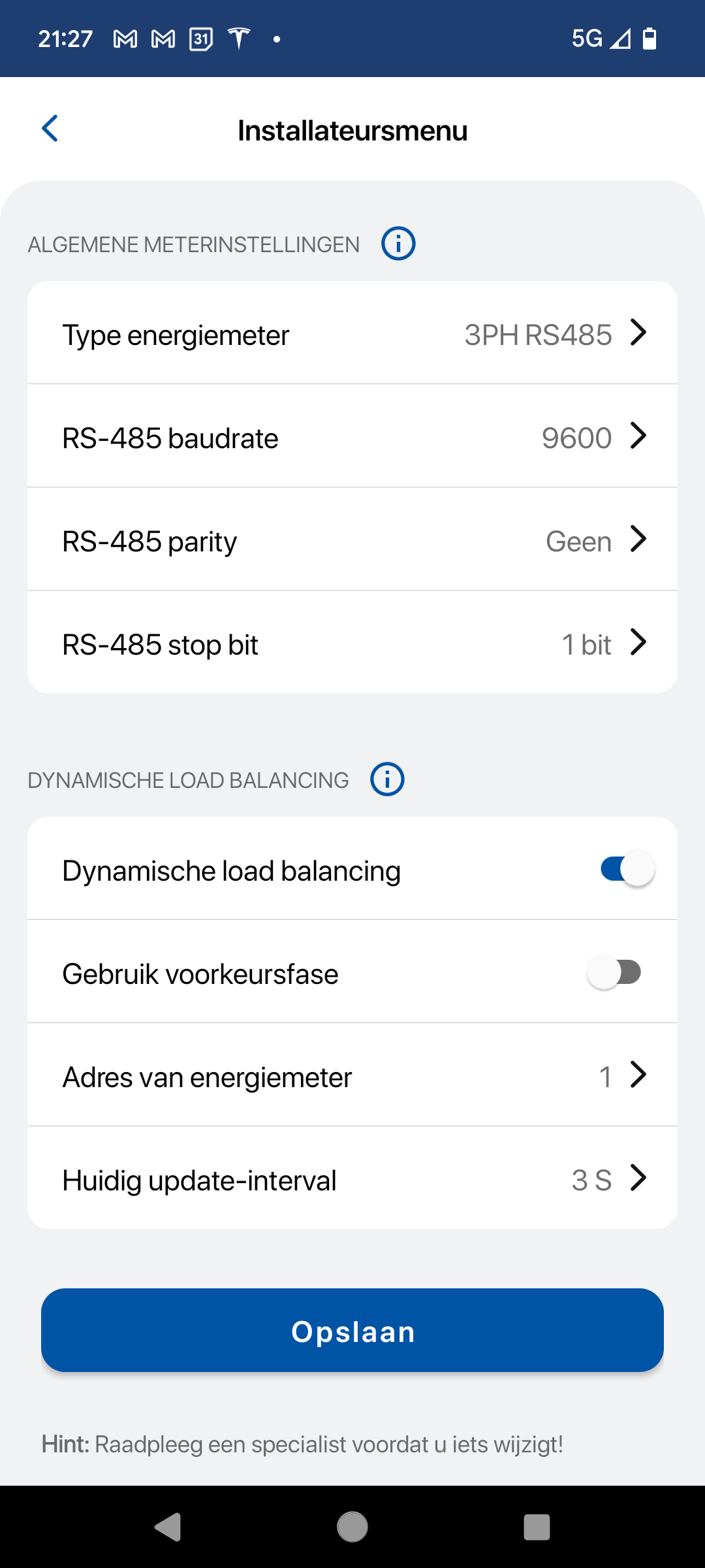 Nadat je verbinding hebt gemaakt met de laadpaal klik je op 1 Instellingen.