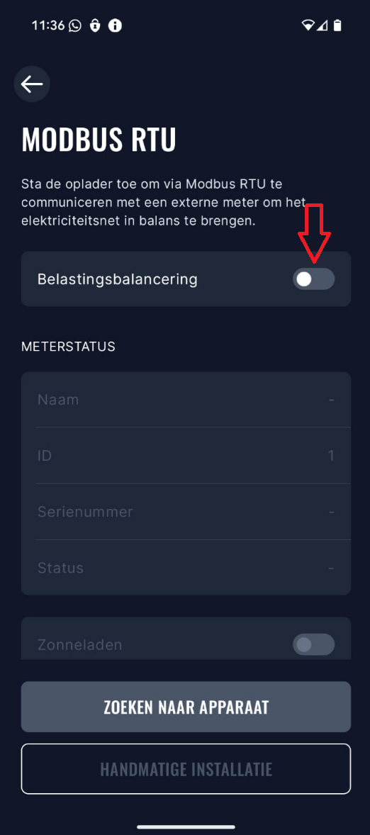U klikt op Modbus RTU meter om vervolgens de Belastingsbalancering UIT te vinken.