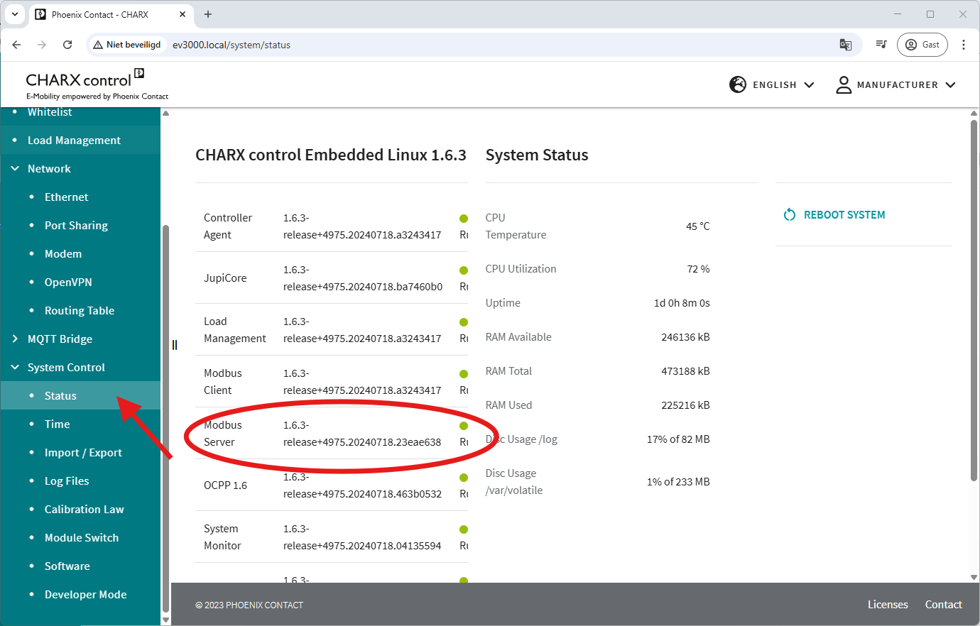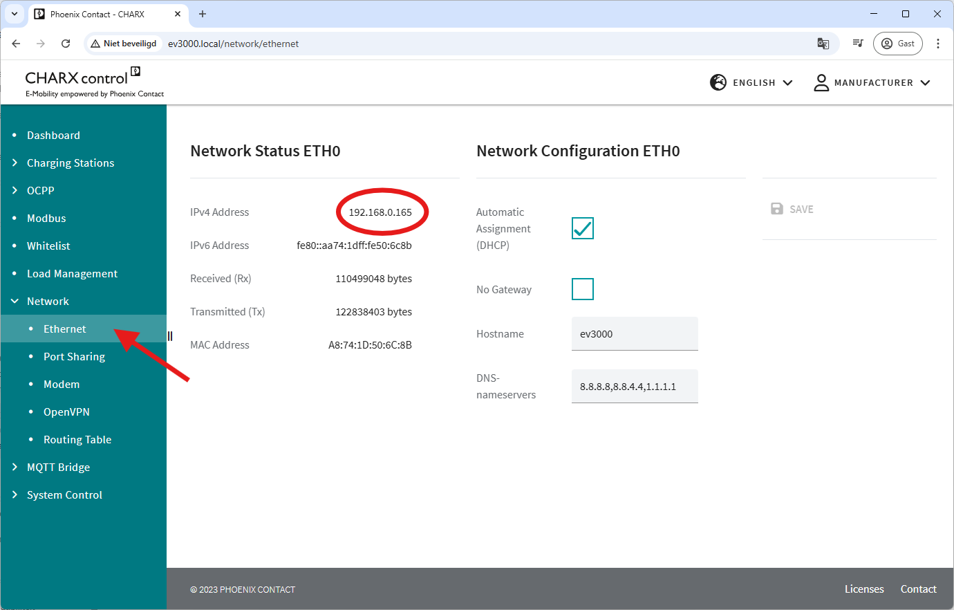 In de Veton laadpaal moet de modbuscommunicatie ingeschakeld zijn om door de Jullix aangestuurd te worden. Je kan dit doen wanneer de laadpaal is aangesloten en met het netwerk is verbonden. Via een computer die met hetzelfde netwerk verbonden is, maak je een verbinding met de webinterface van de laadpaal. Als er maar één laadstation in het netwerk is, kan je dat door 'http://ev3000.local' te typen in de browser of het IP-adres van de laadpaal als je dat kent.