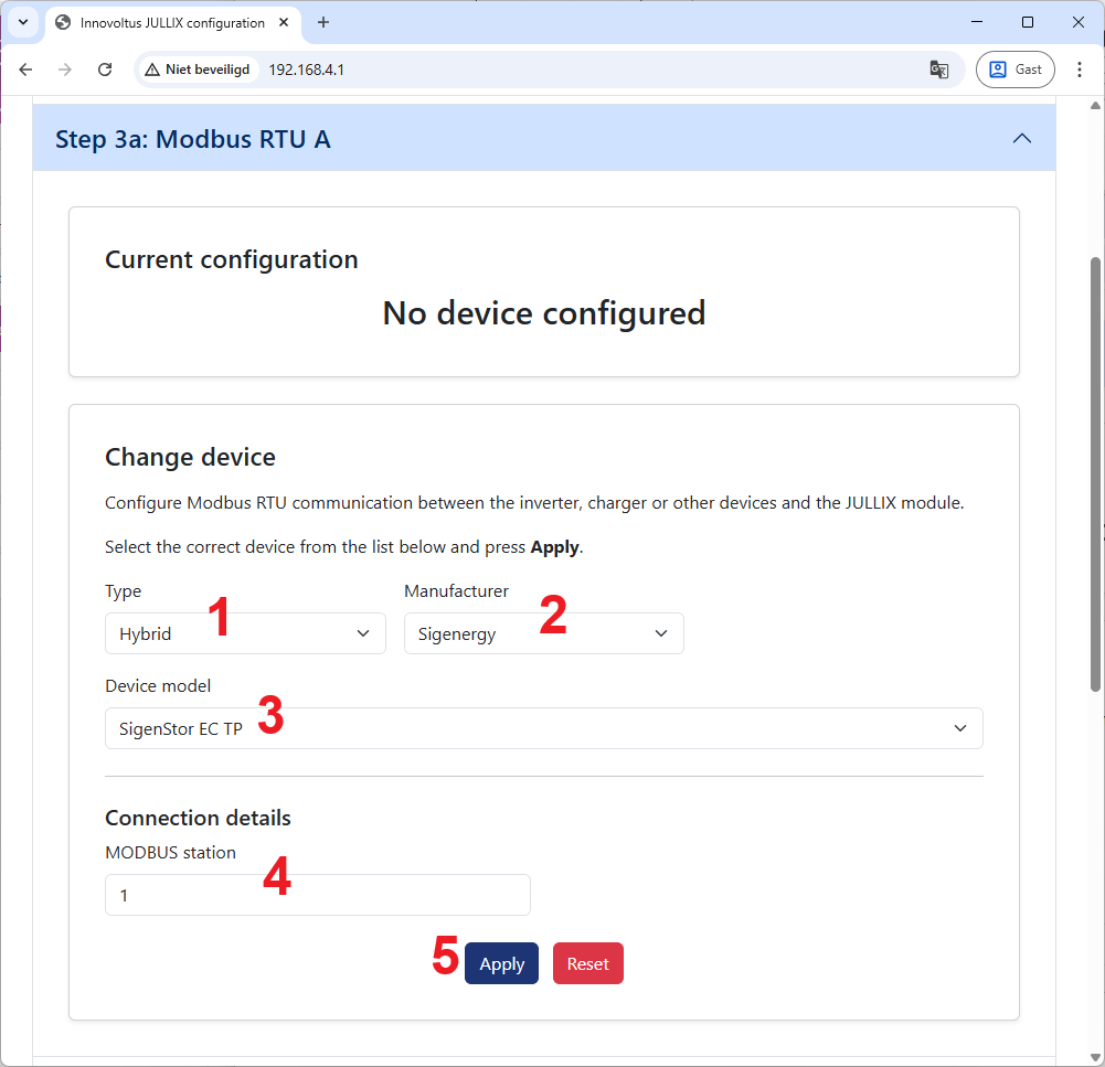 In de Jullix of Extender moet de omvormer communicatie nog geconfigureerd worden. Wanneer je een Sigen Hybrid TP (driefasen) omvormer gebruikt, dan kies je in de modbus RTU configuratie bij Type: Hybrid (1) in de Manufacturer kies je Sigenergy (2). Vervolgens kies je bij Device model, SigenStor EC TP (3).