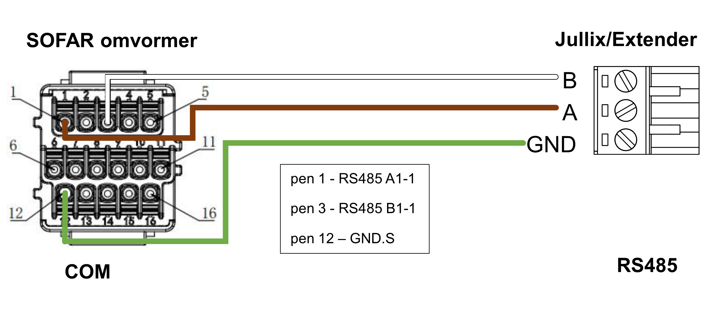 Bij de Jullix gebruik je de beschikbare RS485 poort, op onderstaand schema zie je hoe de aansluitingen moeten gebeuren. In de COM stekker pen 1 → A, pen 3 → B, pen 12 → GND.