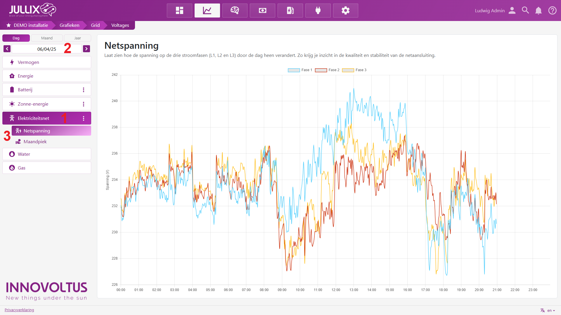 De grafiek van de Netspanning toont de spanning van de verschillende fases (V). Door te klikken op de legende (1) kan je de verschillende fases verbergen of weergeven.