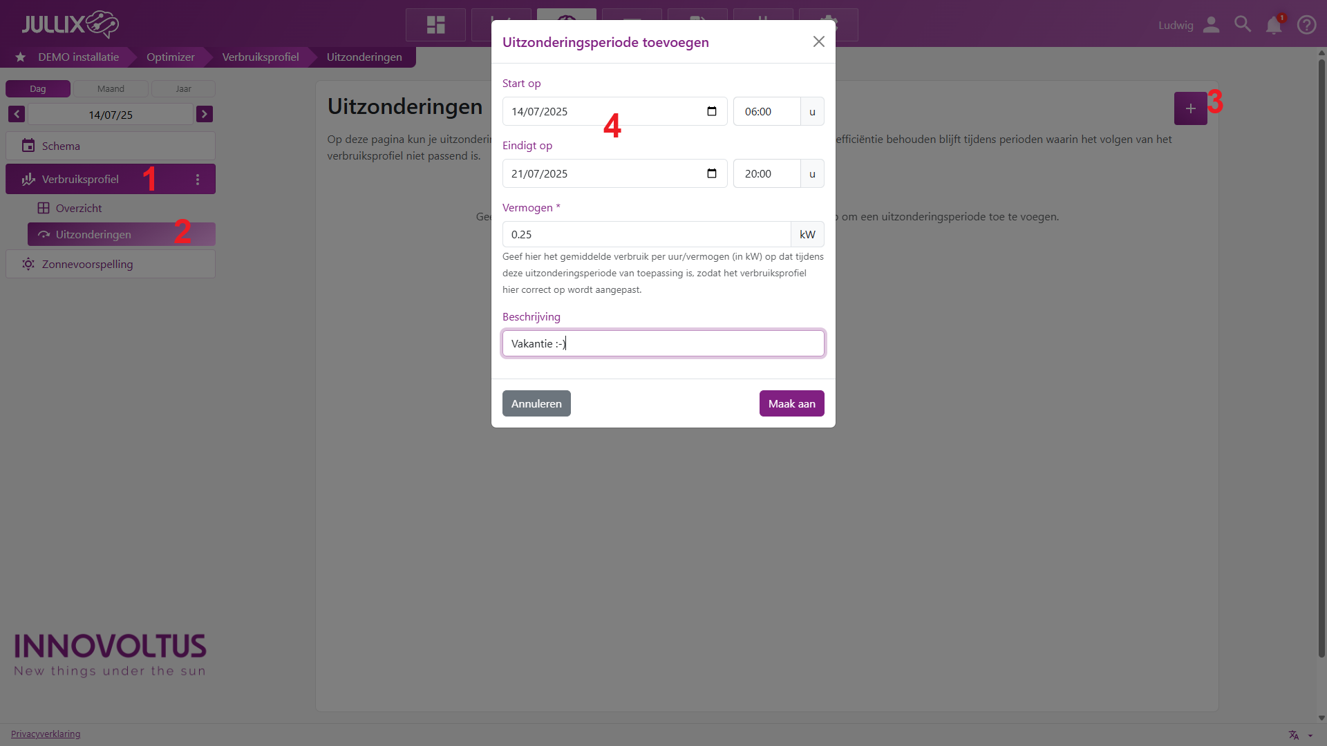 De uitzonderingen hebben een dubbele functie. De Jullix optimizer kan zich onmiddellijk aanpassen aan het aangepaste verbruik, de Jullix optimizer moet dat niet 'leren'. Bijkomend zal het verbruik tijdens deze uitzonderingsperiode niet meegenomen worden in de berekening van je normale verbruiksprofiel, het is immers een 'uitzondering'. Van zodra de uitzondering voorbij is, zal de Jullix onmiddellijk normaliseren en rekening houden met je normale verbruik.