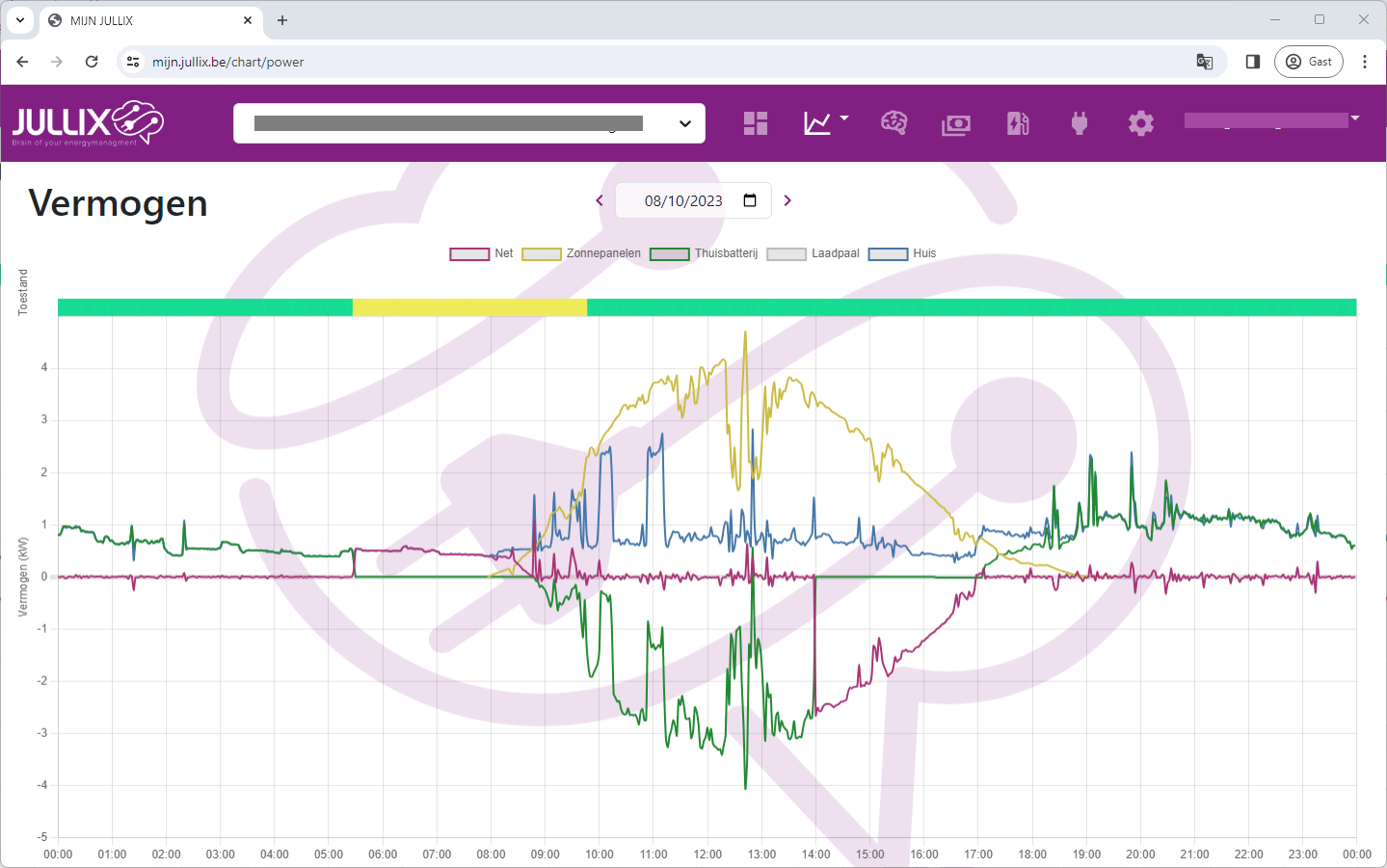 Het vierde voorbeeld toont de vermogensgrafiek van een installatie met zonnepanelen, een thuisbatterij met een Jullix met Smart Energiemanagement. In de installatie is ook een Muon laadpaal geïnstalleerd die geïntegreerd is in het Jullix energiemanagement. Ook hier had de thuisbatterij voldoende energie om het nachtelijk energieverbruik op te vangen. Zodra de zonnepanelen energie opwekken werd het overschot in de thuisbatterij gestopt.