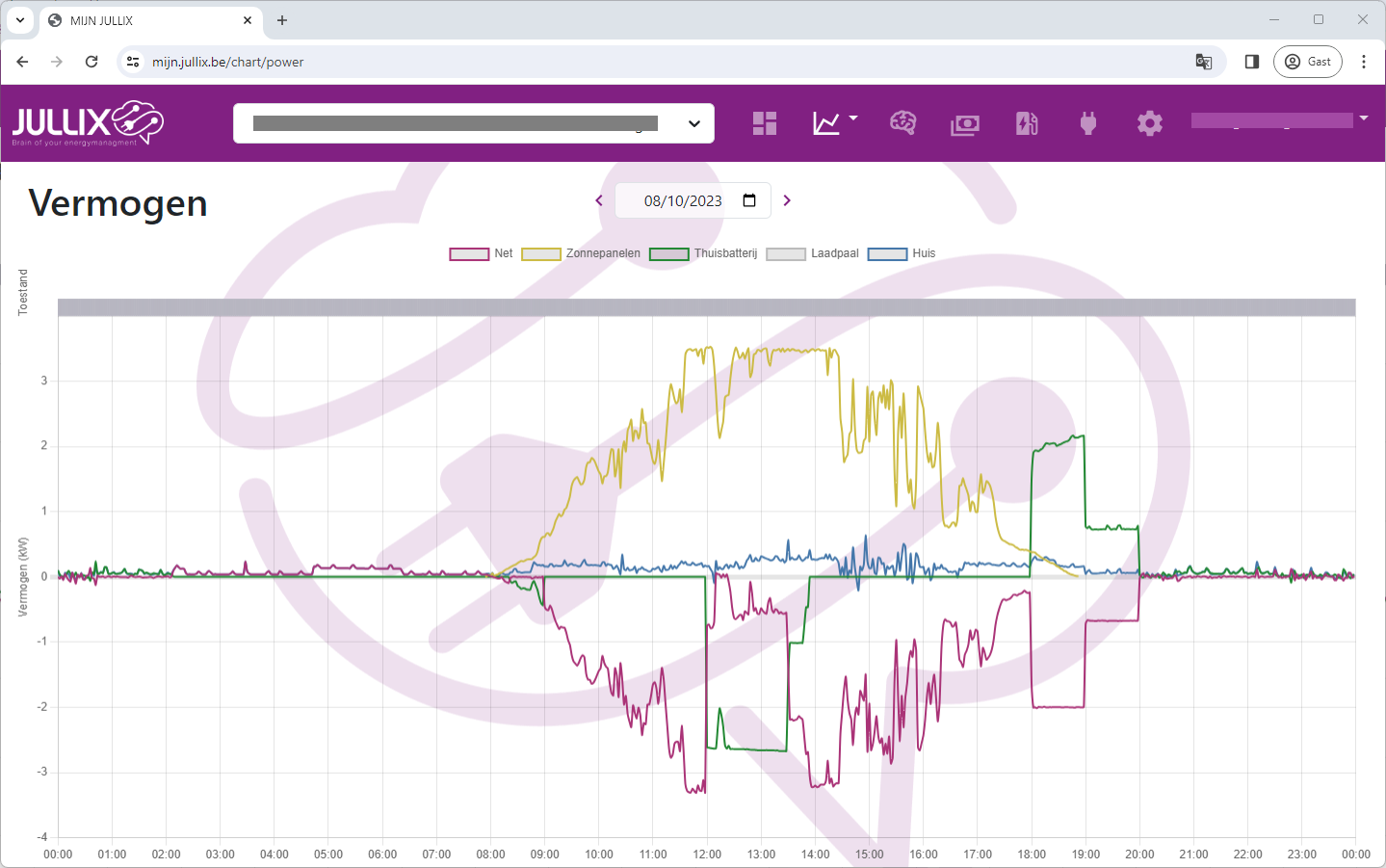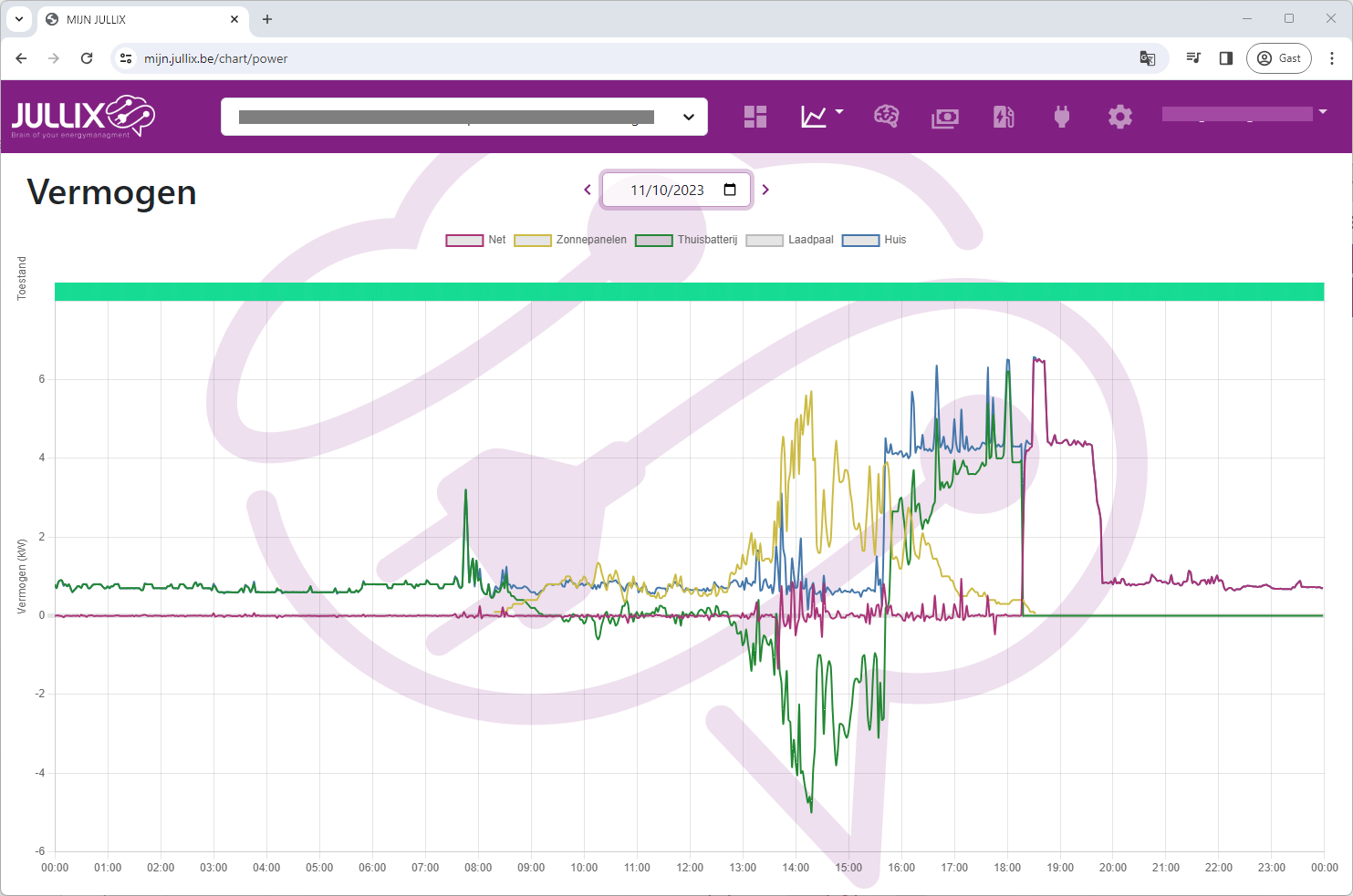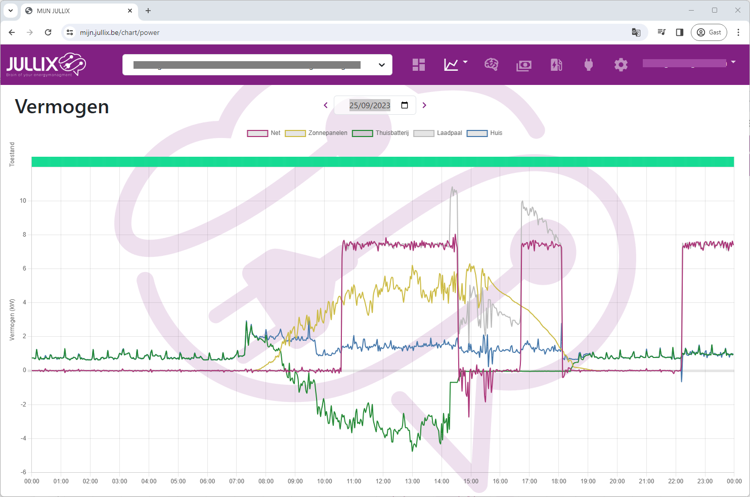 De vermogensgrafiek van een installatie met zonnepanelen, een thuisbatterij en een Jullix met Smart Energiemanagement.