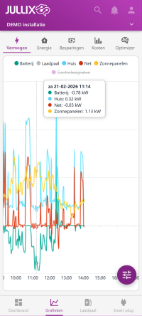 In deze grafiek zie je het vermogen van de verschillende componenten van de installatie gedurende de dag. Via het settingsknopje kan je ook andere dagen bekijken.