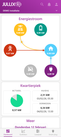 Via het dashboard volg je eenvoudig de realtime werking van het Jullix EMS. Je ziet in vijf vensters onder elkaar wat het energiebeheersysteem doet en wat er het effect van is.