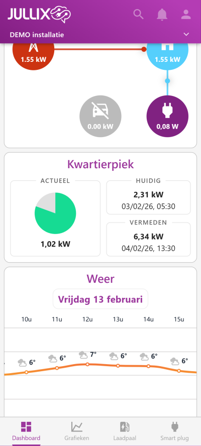 Onder de huidige piek zie je de vermeden piek. Dat is de kwartier piek die je werkelijk gebruikt hebt maar die niet is geregistreerd door de digitale meter. Die piek is niet geregistreerd door de digitale meter, omdat de Jullix energie van andere bronnen als het net heeft ingeschakeld zoals PV, of thuisbatterij.