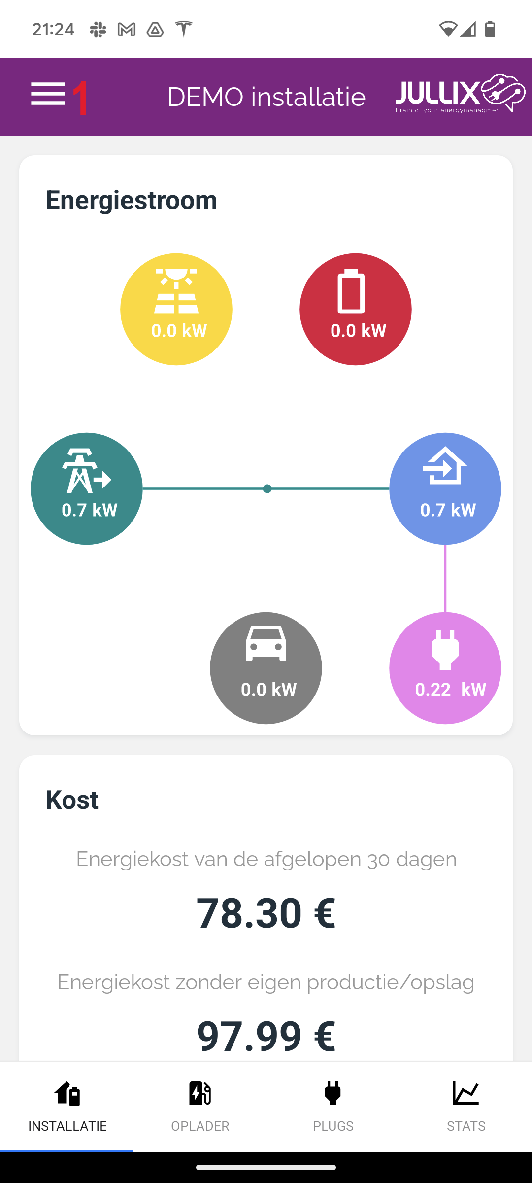Via het menu(1) kan je de verschillende pagina's kiezen. Je kan er ook een andere installatie kiezen(2) als je toegang hebt tot andere installaties.