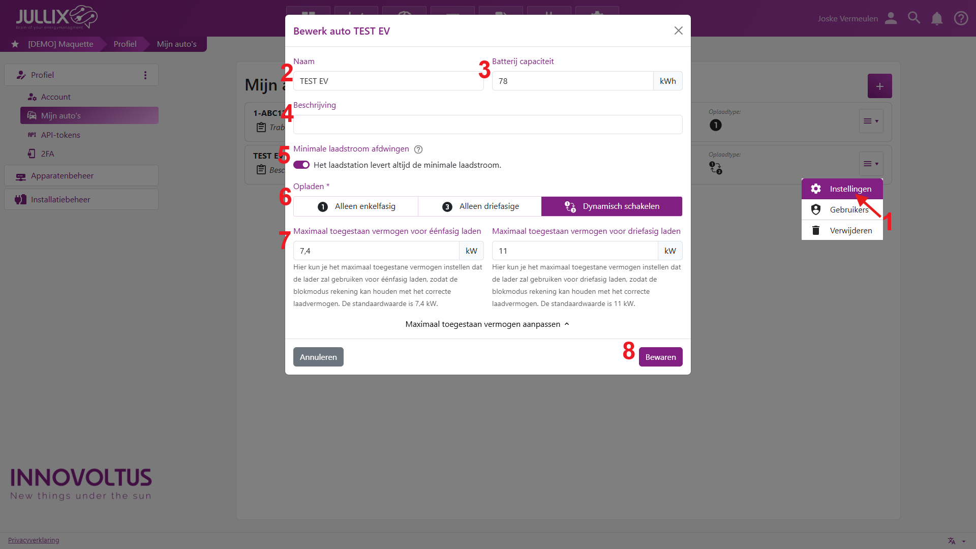 Voor de gekozen laad wijze (6), kan je dan de maximum vermogens instellen: (7).