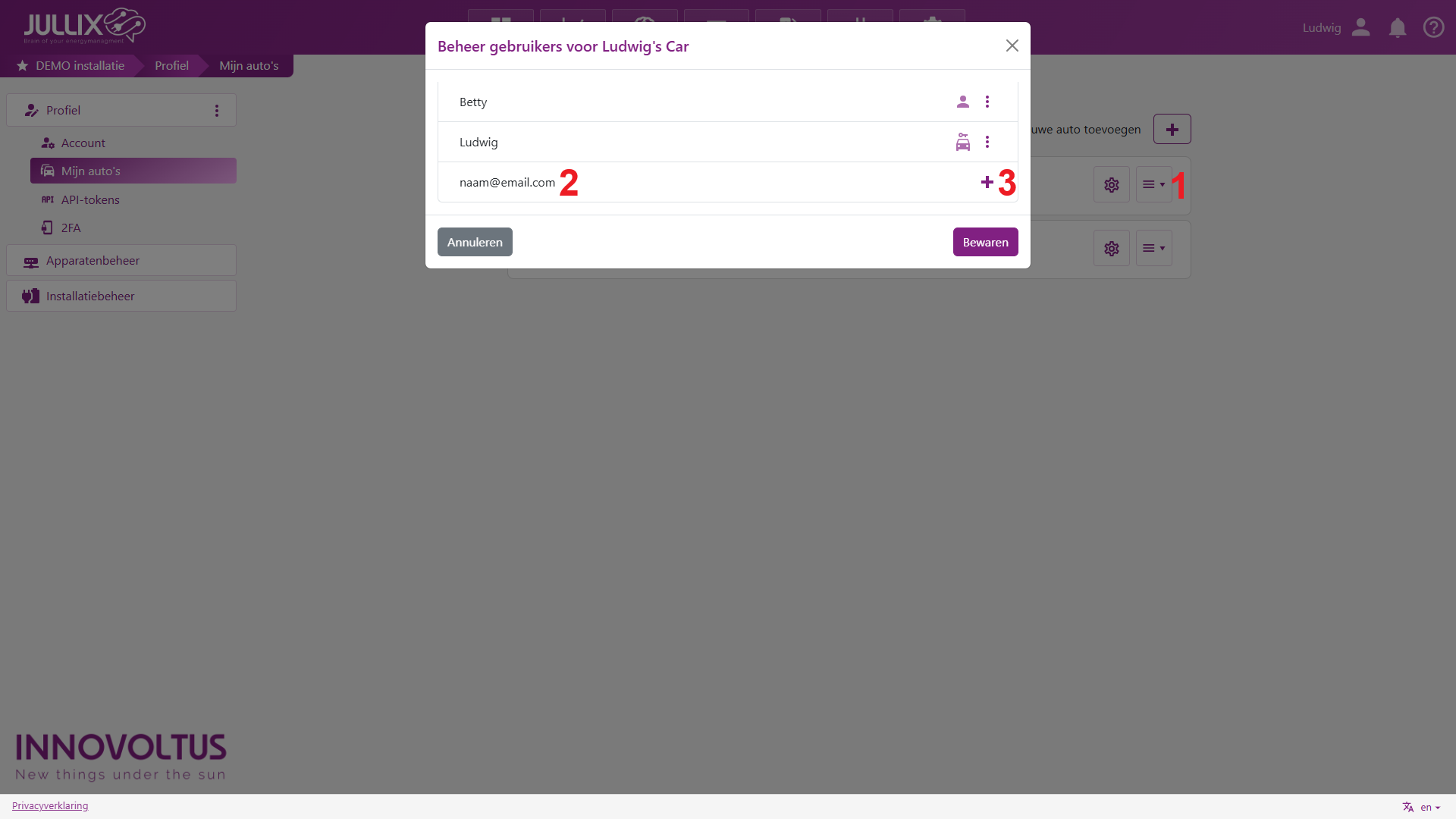 Om een gebruiker toe te voegen, geef je zijn e-mailadres in (2) en je klikt op Toevoegen (3).