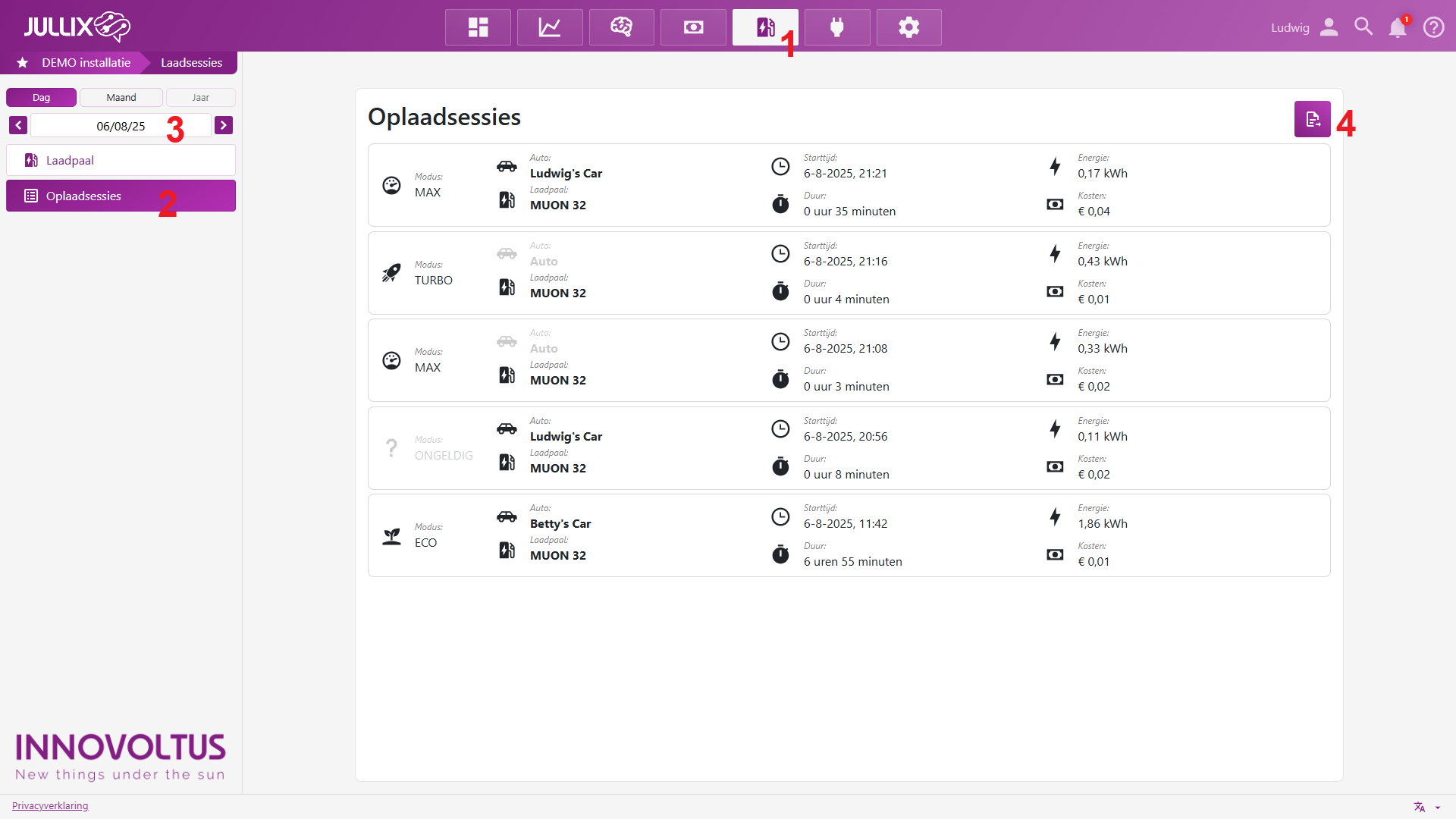Je krijgt een pagina met daarin de verschillende oplaadsessies. Je kan de datum kiezen 3 en de laadsessies per dag of maand 3 weergeven.