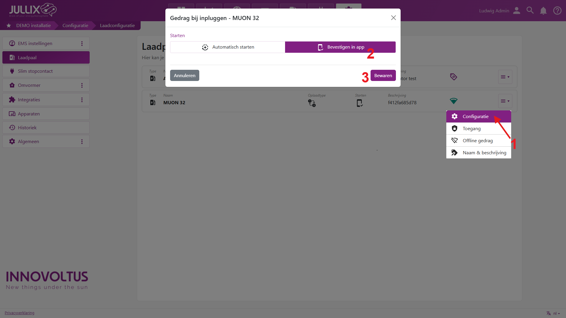Als je Bevestigen in app (2) kiest, dan start het laden niet onmiddellijk wanneer je de kabel in het voertuig stopt. Via Bewaren (3) worden de instellingen bewaard. Je moet in dit geval altijd via de app bevestigen. Op die manier is je laadpaal beveiligd tegen ongeoorloofd gebruik.