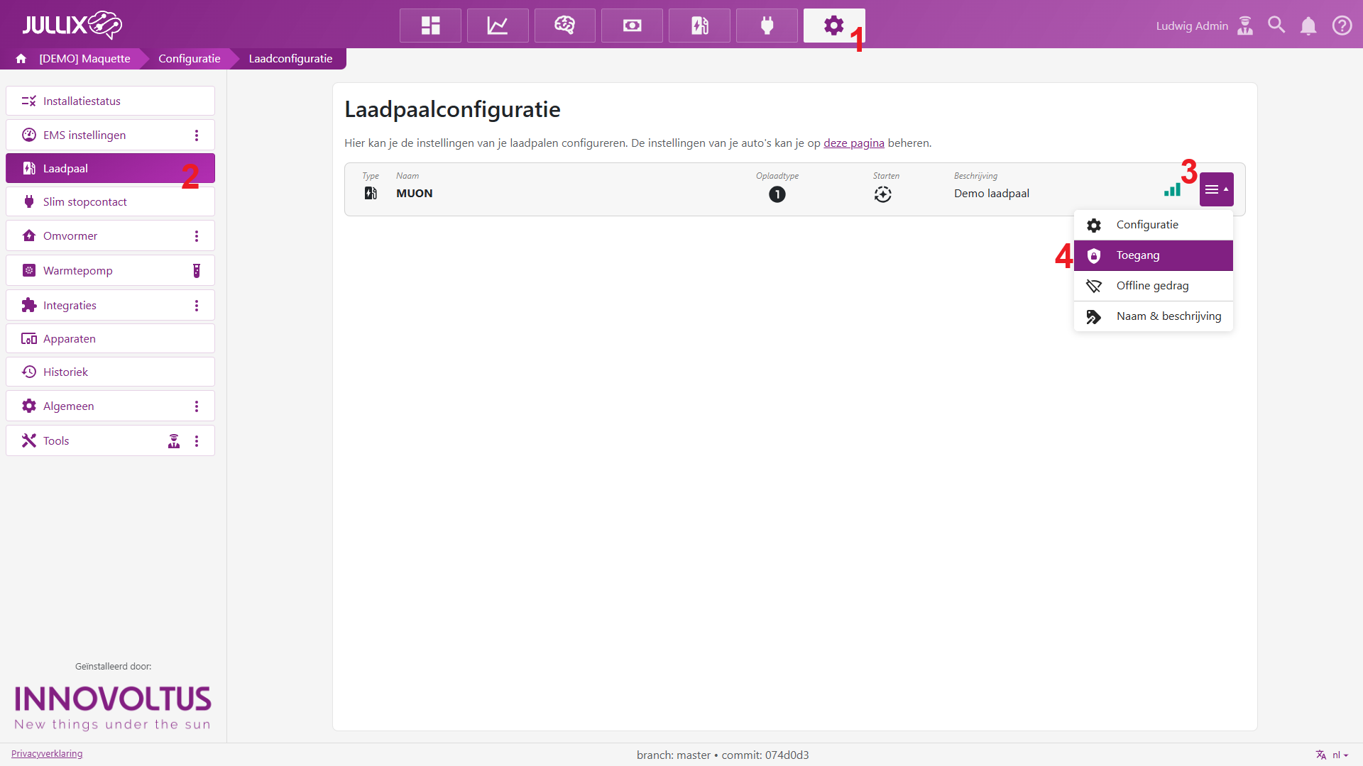 Toegang (4) kan je instellen welke Auto's geladen mogen worden aan de laadpaal. Je krijgt een lijst met auto's die toegang hebben tot de laadpaal.