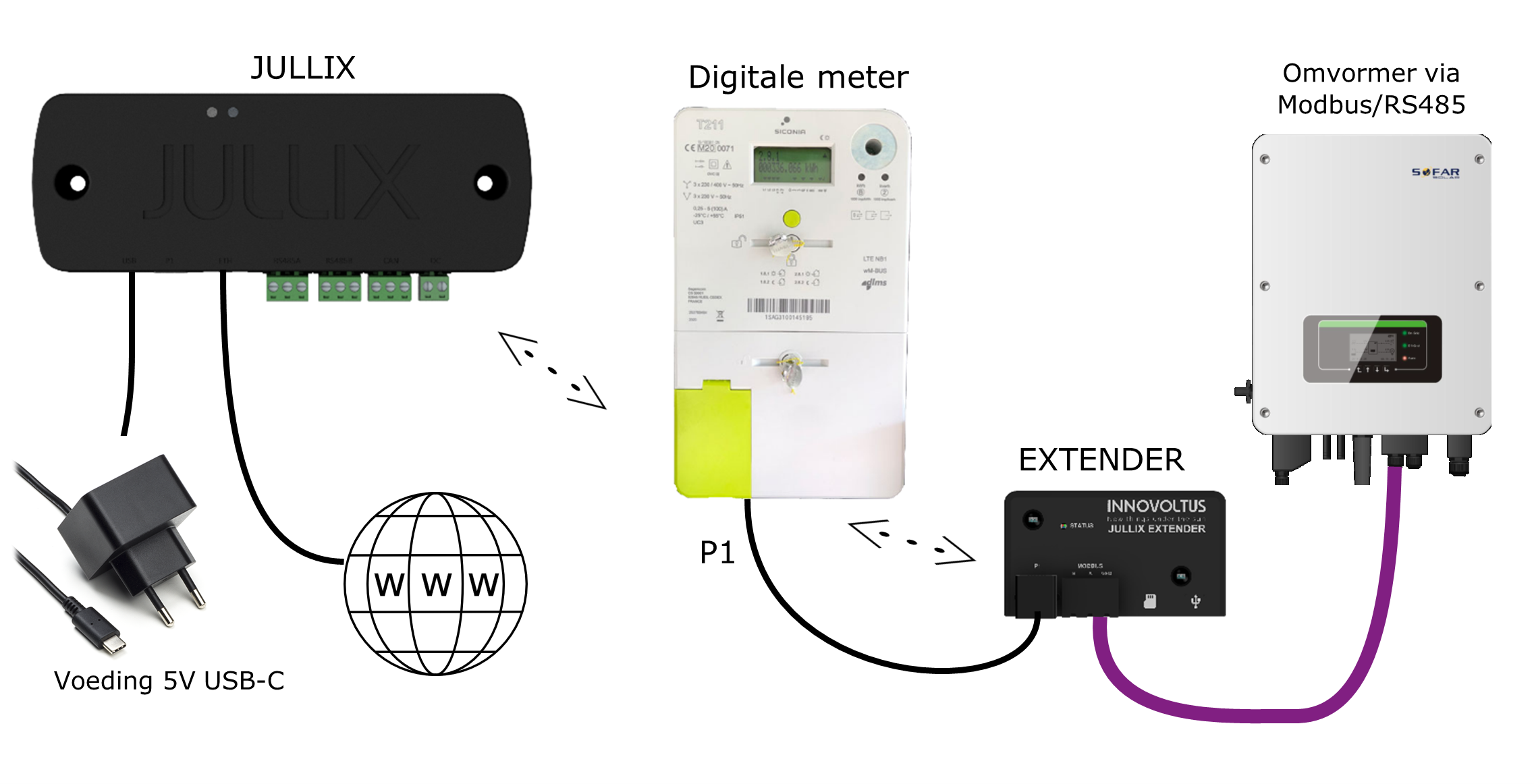 Als de digitale meter ook aan de extender wordt aangesloten, dan heeft de extender geen extra voeding nodig. In dat geval wordt Jullix gevoed via USB-C.