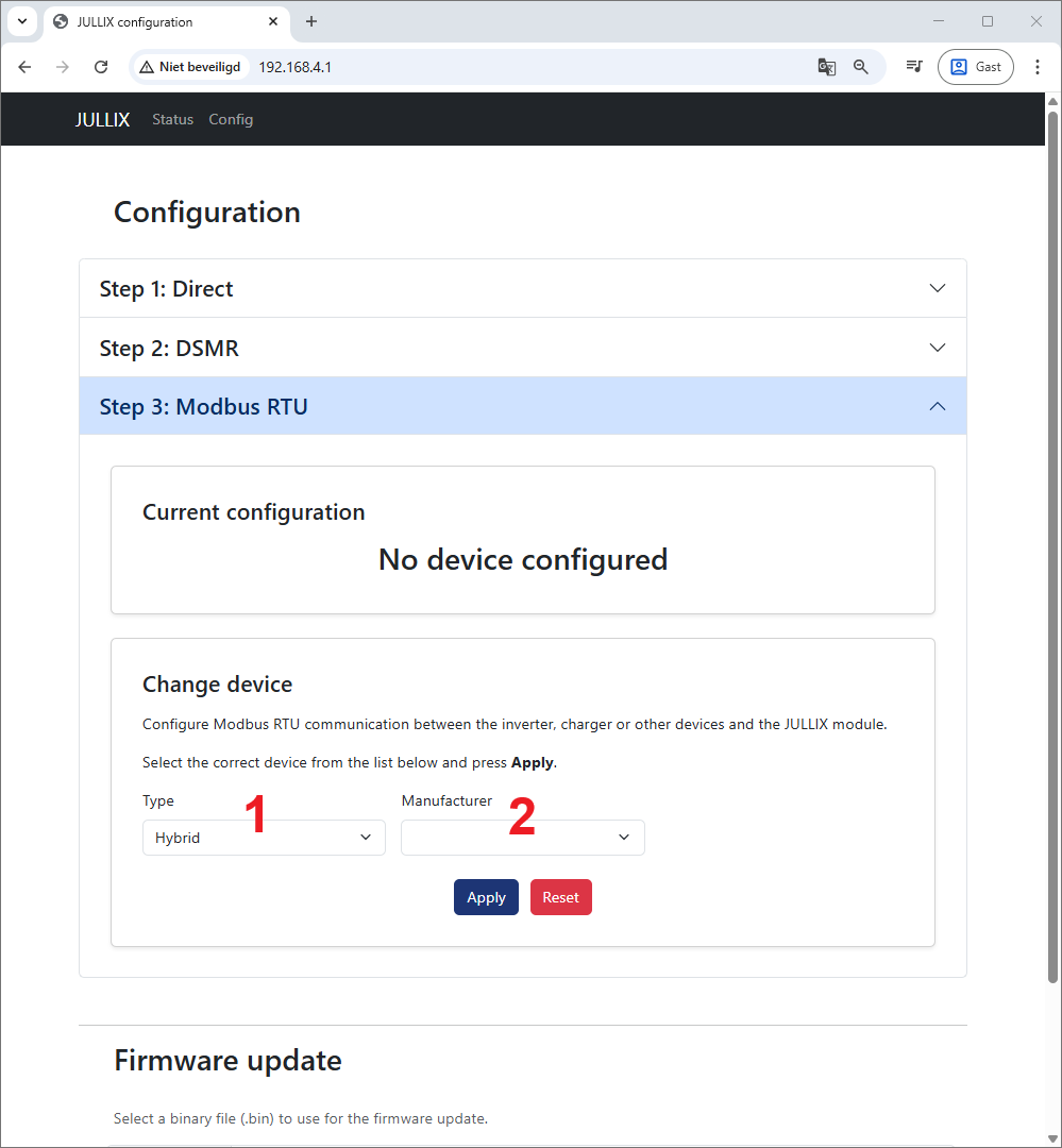 Current configuration: toont wat er momenteel geconfigureerd is. Bij Type (1) kies je het type apparaat dat via de modbus-poort is aangesloten. Bij Manufacturer (2) kan je het merk van apparaat kiezen.
