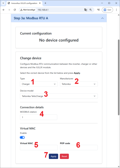 Vervolgens moet nog een virtueel MAC-adres ingesteld worden om de TeltoCharge laadpaal te identificeren. Dit Virtuele MAC-ID is absoluut noodzakelijk om de laadpaal via Jullix te kunnen besturen. Bij Virtual MAC Enable je dit en vul je het Virtual MAC 5 met bijhorende POP code 6 in.