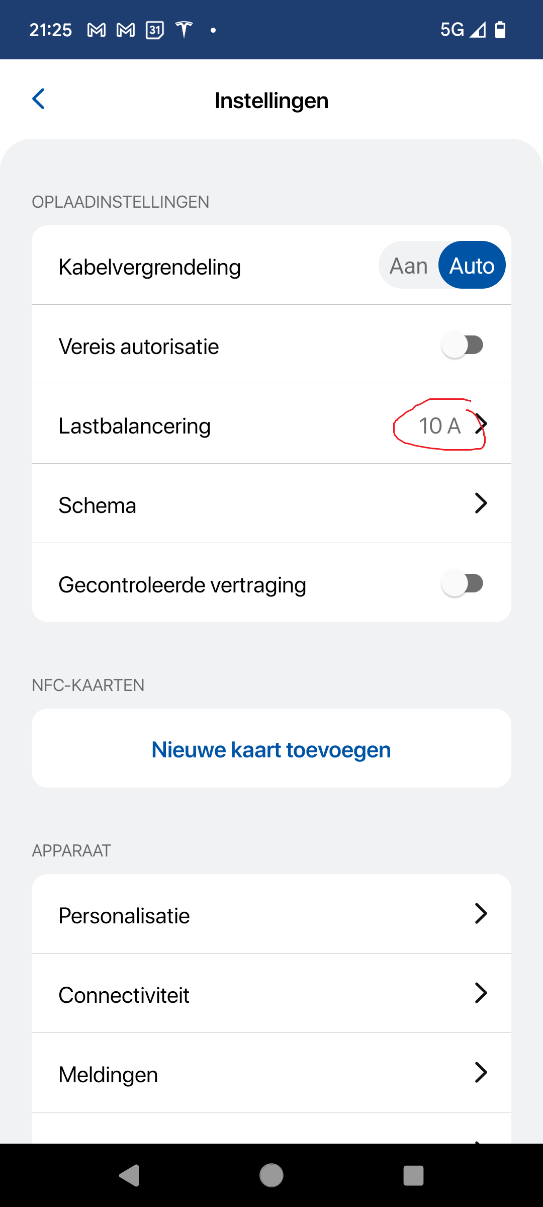 In het instellingen-menu stel je de beveiling(zekering) van je laadpaal in. Als je dynamisch wil schakelen van 1 naar 3 fase moet je zekering minimaal 16A zijn en stel je die hier ook zo in.
