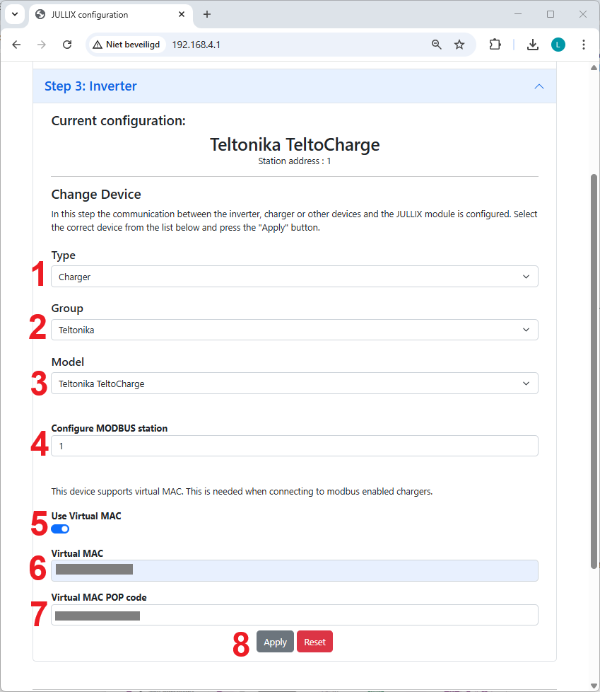 Vervolgens moet nog een virtueel MAC-adres ingesteld worden om de TeltoCharge laadpaal te identificeren. Dit Virtuele MAC-ID is absoluut noodzakelijk om de laadpaal via de Jullix te kunnen besturen. Je schakelt Use Virtual MAC 5 in en je vult het Virtual MAC 6 met bijhorende Virtual MAC POP code 7 in.
