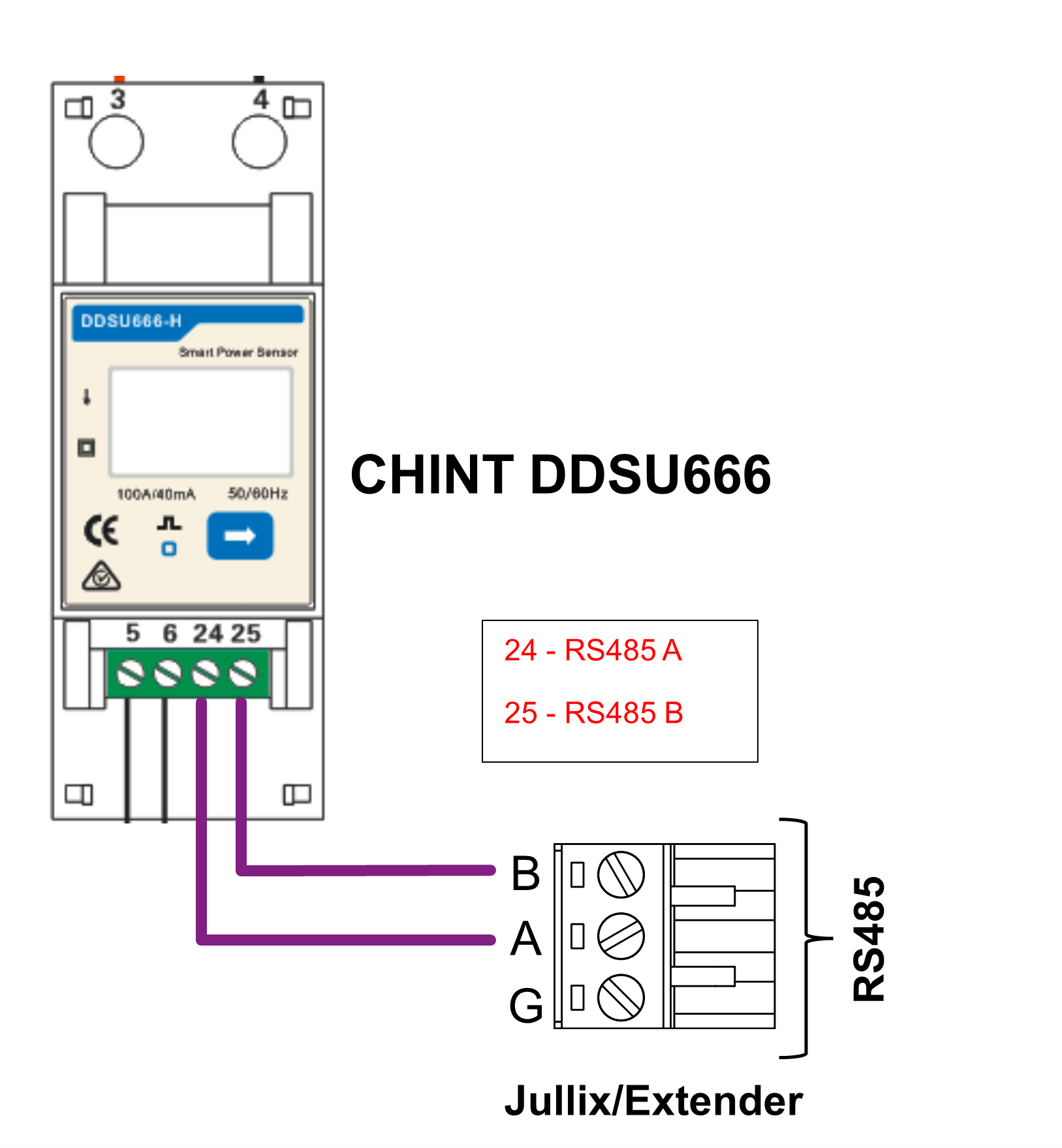 De Jullix of Extender wordt verbonden met de CHINT energiemeter via de RS485 aansluitingen.