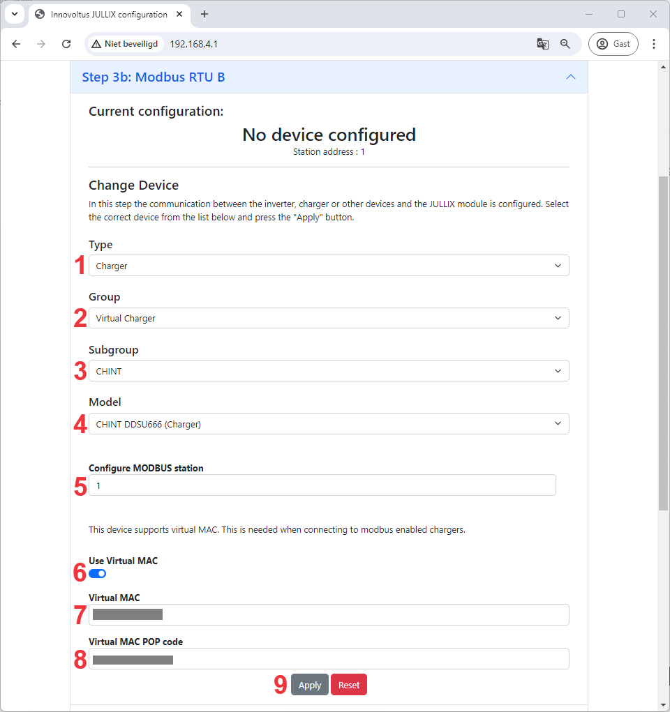Wanneer je de CHINT energiemeter gebruikt om laadpaal-energie te meten, dan kies je in de modbus RTU configuratie bij Type: Charger (1) in de Group kies je Virtual Charger (2). In de Subgroup duidt je dan de juiste merk aan, in dit geval CHINT (3) en vervolgens het juiste model CHINT DDSU666 (4). In Configure modbus station stel je het juiste modbus adres in; meestal is dit 1 (5).