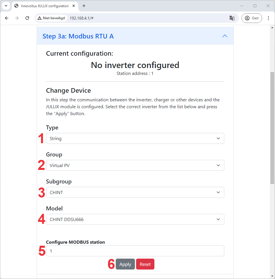 Wanneer je de CHINT energiemeter gebruikt om PV-energie te meten, dan kies je in de modbus RTU configuratie bij Type: String (1) in de Group kies je PV Energy (2). In de Subgroup duidt je dan de juiste merk aan, in dit geval CHINT (3) en vervolgens het juiste model CHINT DDSU666 (4). In Configure modbus station stel je het juiste modbus adres in; meestal is dit 1 (5). Via Apply (6) worden de instellingen bewaard.