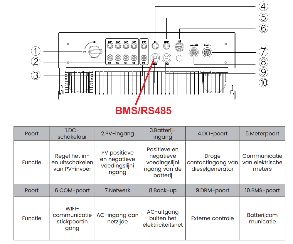 De Jullix of Extender wordt verbonden met de Goneo hybride omvormer via modbus/RS485 van de omvormer. Je vindt de RS485 aansluiting terug op de BMS poort van de omvormer. Je hebt een splitter nodig om zowel de batterij als de Jullix met de BMS poort te verbinden. Deze splitter kan je bij GONEO bekomen.
