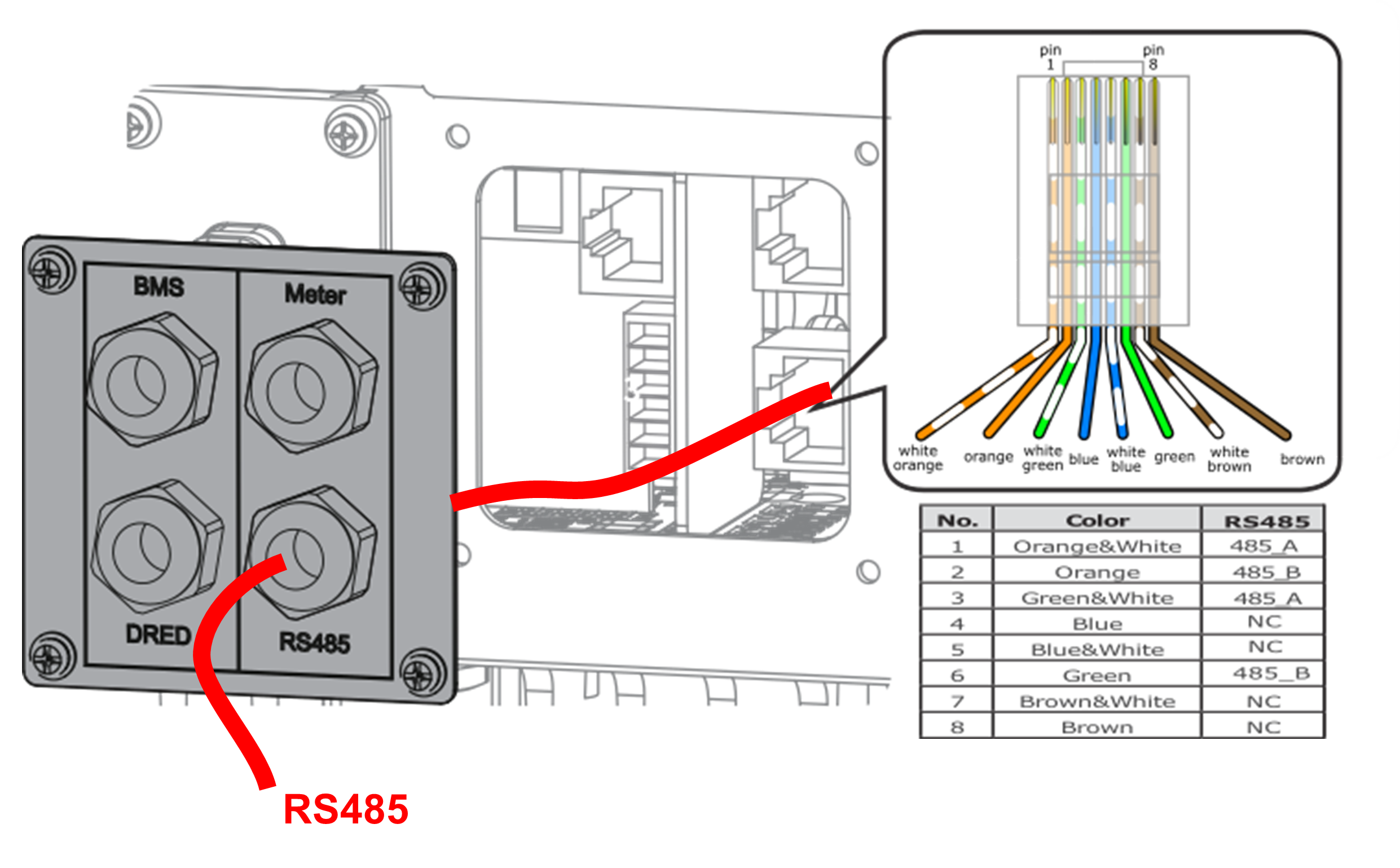 Op onderstaand schema zie je hoe de aansluitingen moeten gebeuren. Signaal goodwe RJ45: 1 wit/oranje → A en 2 oranje → B.