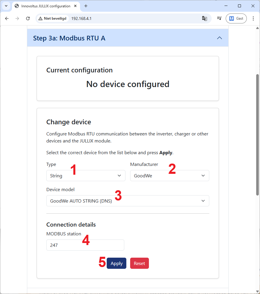 In de Jullix of Extender moet de omvormer communicatie nog geconfigureerd worden. Wanneer je deze Goodwe string omvormer gebruikt, dan kies je in de modbus RTU configuratie bij Type: string (1) in de Manufacturer kies je GoodWe (2). Bij Device Model (3) kies je het juiste model, bijvoorbeeld GoodWe AUTO STRING (DNS).