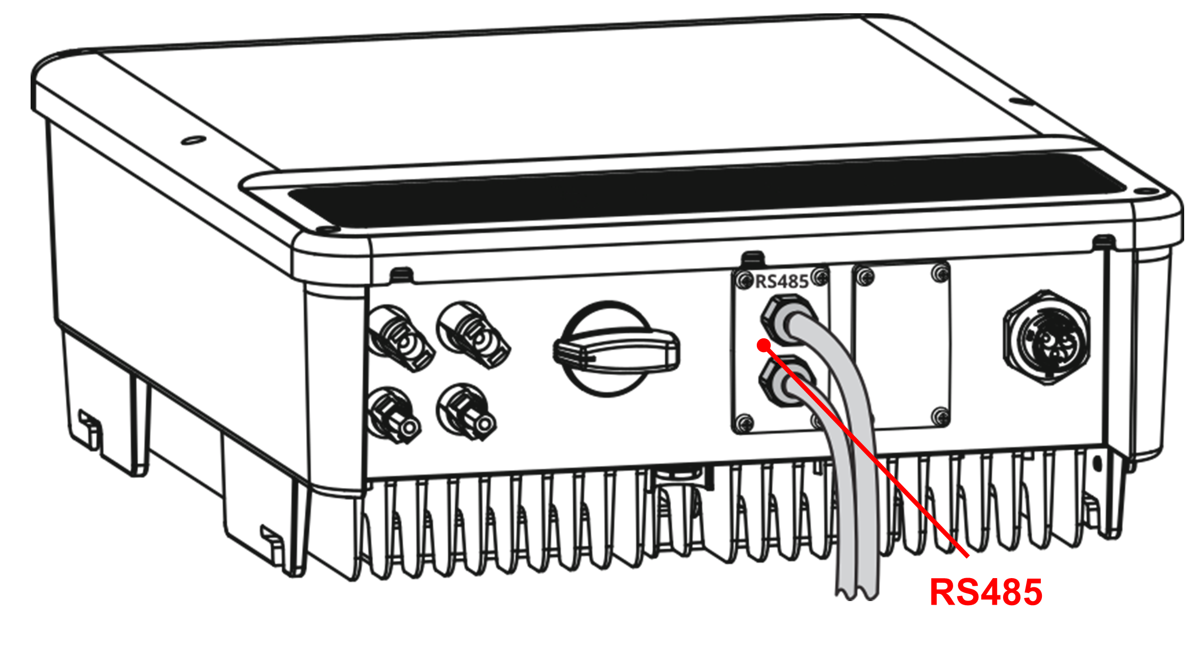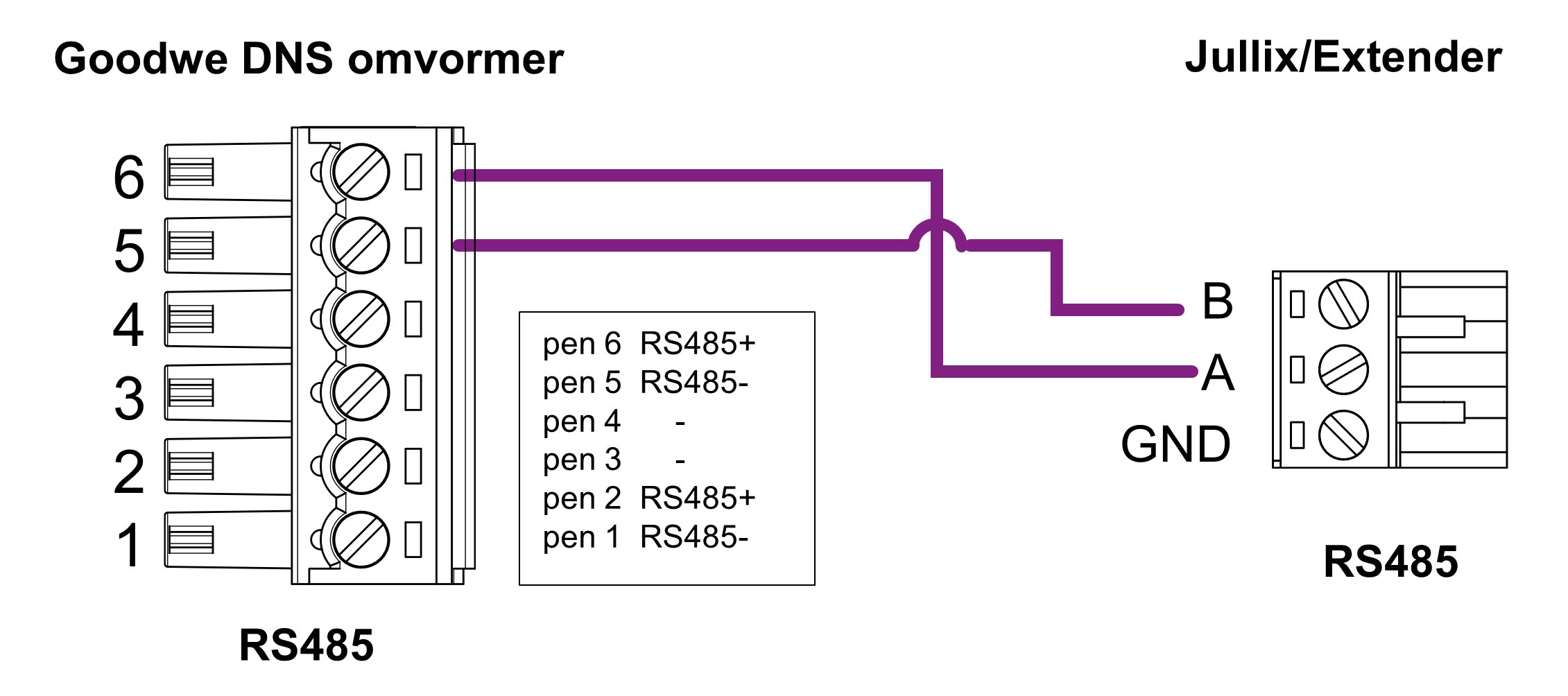 De Jullix of Extender wordt verbonden met de Goodwe DNS via modbus/RS485 van de omvormer. Je vindt de Modbus aansluiting terug op de RS485.