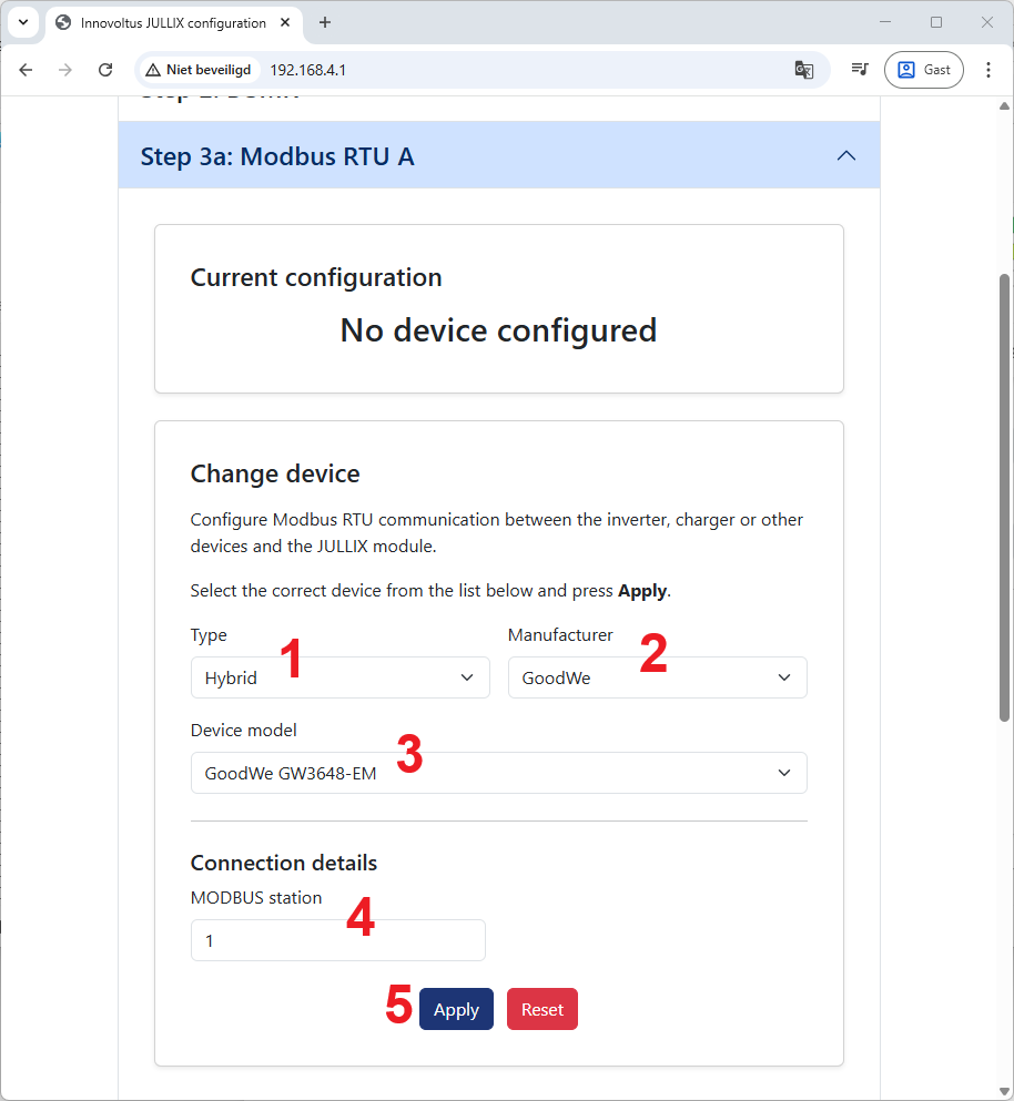 In de Jullix of Extender moet de omvormer communicatie nog geconfigureerd worden. Wanneer je een Goodwe hybride omvormer gebruikt, dan kies je in de modbus RTU configuratie bij Type: Hybrid (1) in de Manufacturer kies je Goodwe (2). Bij Device Model (3) kies je het juiste model, bijvoorbeeld GoodWe GW3648-EM voor een eenfase omvormer van 3,6kW vermogen.