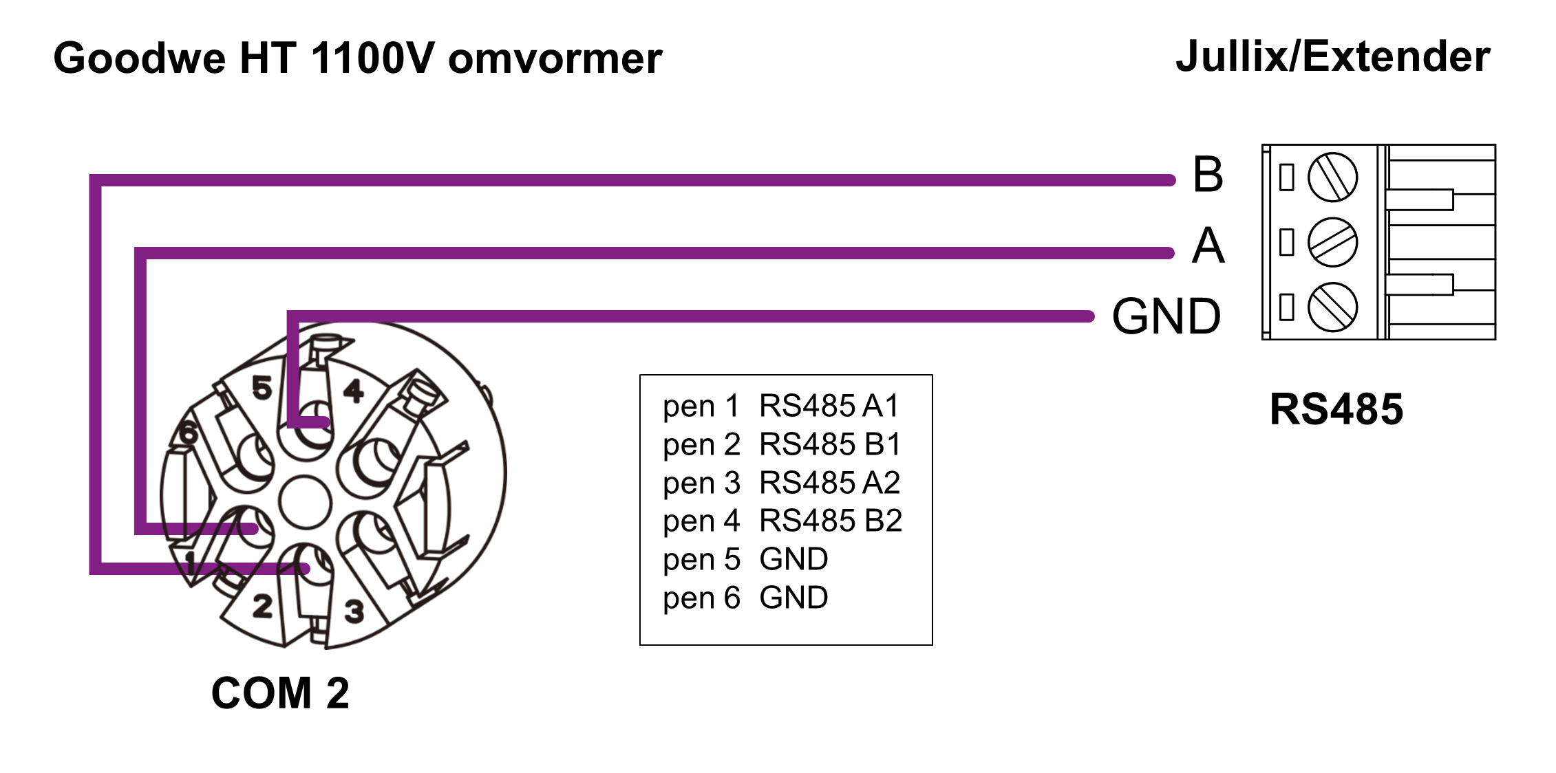De Jullix of Extender wordt verbonden met de Goodwe HT 1100V via modbus/RS485 van de omvormer. Je vindt de modbus aansluiting terug op de COM 2 poort.