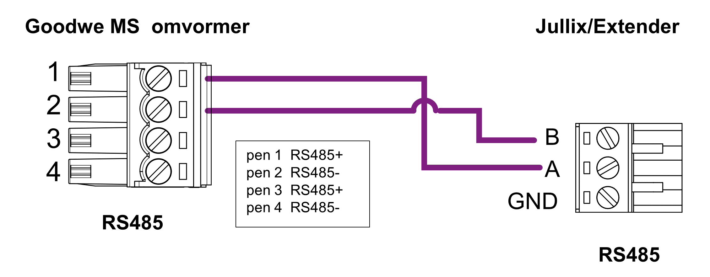 De Jullix of Extender wordt verbonden met de Goodwe MS omvormer via modbus/RS485 van de omvormer. Je vindt de Modbus aansluiting terug op de RS485.