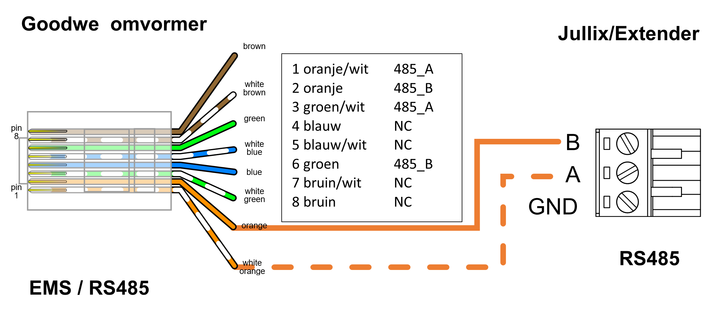 Op onderstaand schema zie je hoe de aansluitingen moeten gebeuren. Signaal goodwe RJ45: 1 wit/oranje → A en 2 oranje → B.