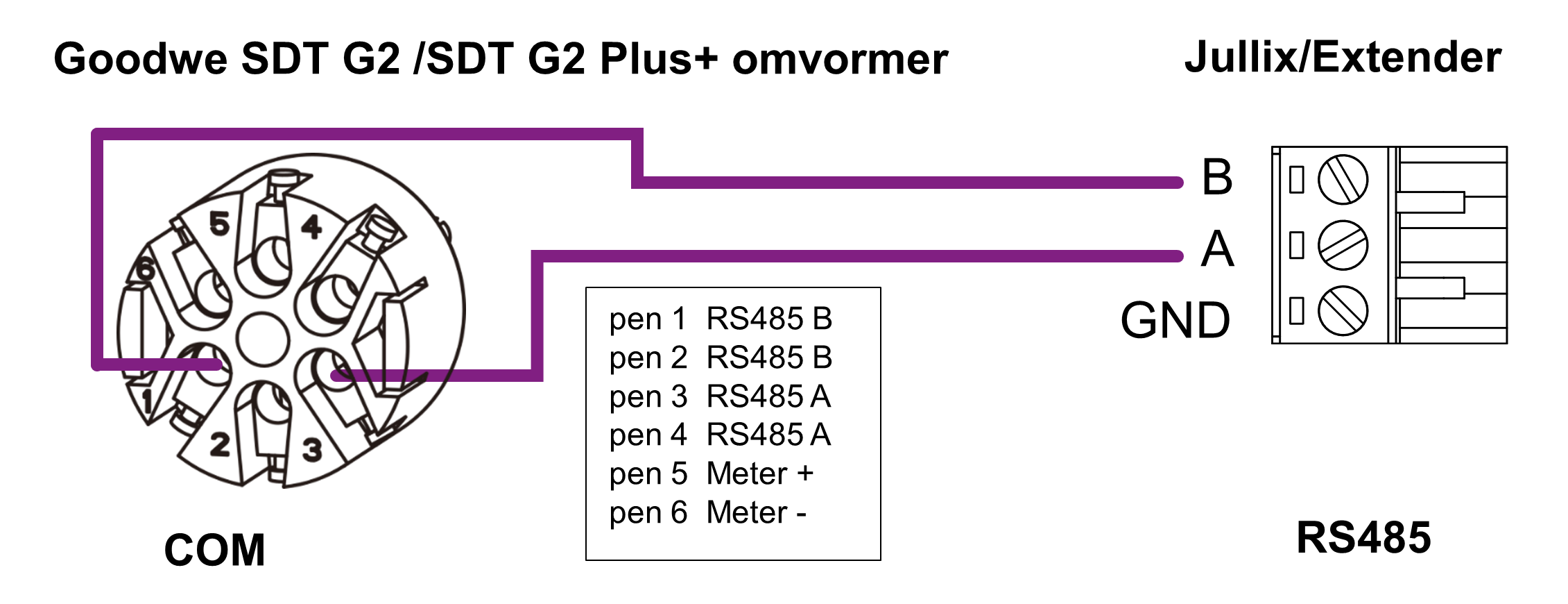 Op onderstaand schema zie je hoe de aansluitingen moeten gebeuren. Signaal goodwe pen 1 → B en pen 3 → A.