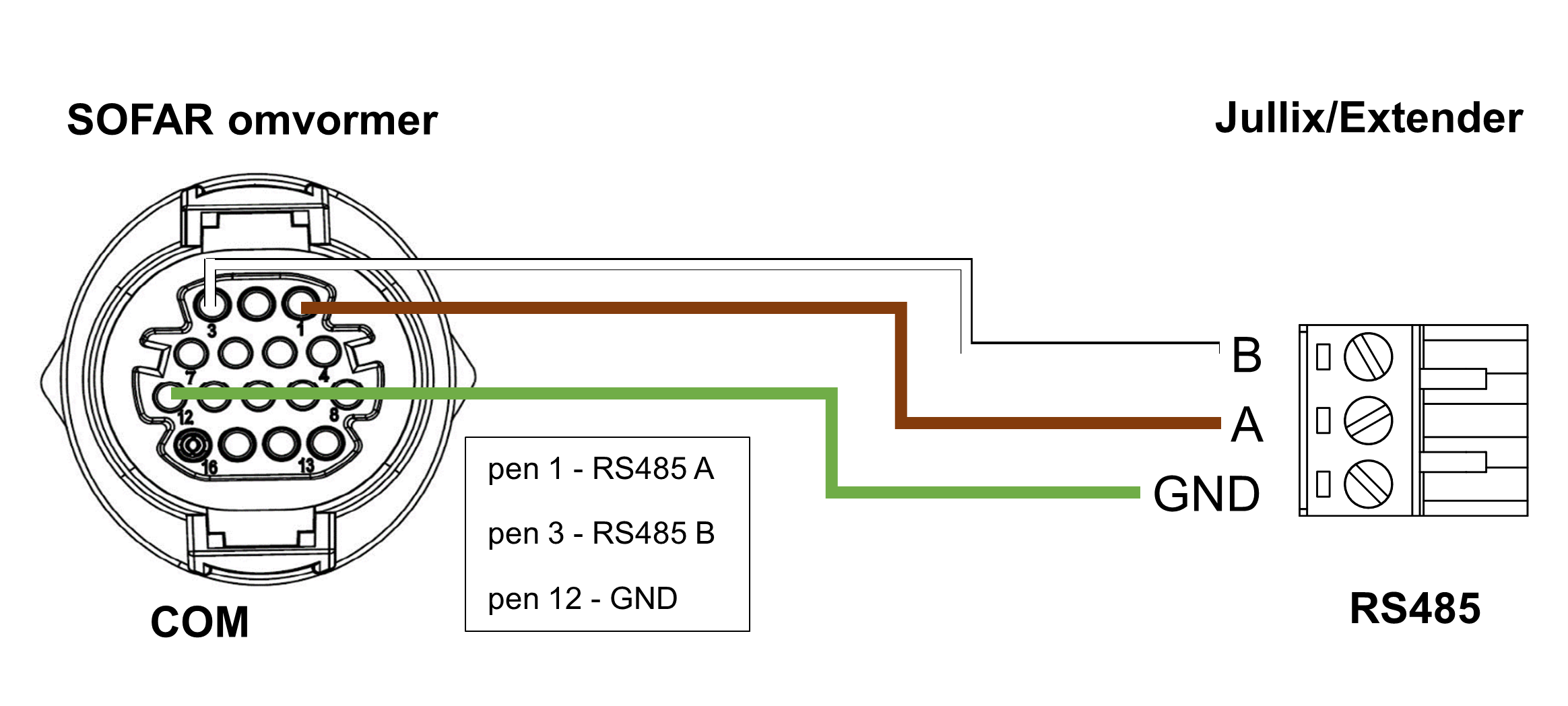 Bij de Jullix gebruik je de beschikbare RS485 poort, op onderstaand schema zie je hoe de aansluitingen moeten gebeuren. In de COM stekker pen 1 → A, pen 3 → B, pen 12 → GND.