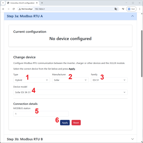 In de Jullix of Extender moet de omvormer communicatie nog geconfigureerd worden. Wanneer je een Sofar POWERALL hybride omvormer gebruikt, dan kies je in de modbus RTU configuratie bij Type: Hybrid (1) in de Group kies je Sofar (2). In de Subgroup kies je in dit geval ESI S1 (3) en vervolgens het juiste Model, bijvoorbeeld Sofar ESI 3K-S1 (4). In Configure modbus station stel je het juiste modbus adres in; meestal is dit 1 (5). Via Apply (6) worden de instellingen bewaard.