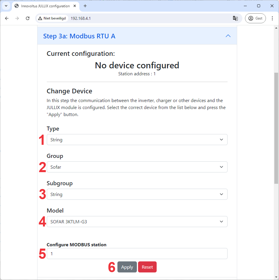 In de Jullix of Extender moet de omvormer communicatie nog geconfigureerd worden. Wanneer je een SOFAR string omvormer gebruikt, dan kies je in de modbus RTU configuratie bij Type: String (1) in de Group kies je Sofar (2). In de Subgroup kies je in dit geval opnieuw String (3) en vervolgens het juiste Model, bijvoorbeeld SOFAR 3KTLM-G3 (4). In Configure modbus station stel je het juiste modbus adres in; meestal is dit 1 (5). Via Apply (6) worden de instellingen bewaard.
