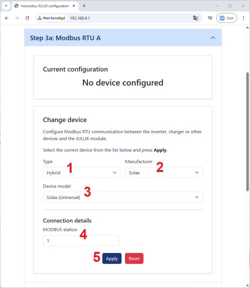 Wanneer je een Solax Gen4 X1 hybride omvormer gebruikt, dan kies je in de modbus RTU configuratie bij Type: Hybrid (1), bij Manufacturer kies je Solax (2). Vervolgens kies je bij Device model, Solax (Universal)(3).
