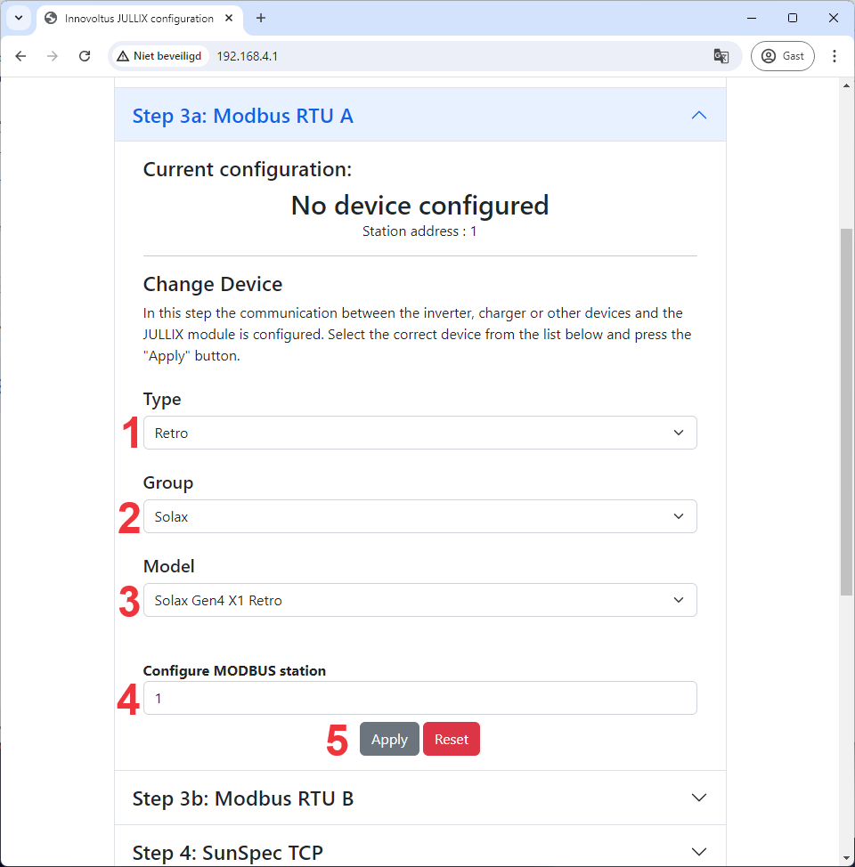 In de Jullix of Extender moet de omvormer communicatie nog geconfigureerd worden. Wanneer je een Solax Gen4 X1 retro omvormer gebruikt, dan kies je in de modbus RTU configuratie bij Type: Retro (1) in de Group kies je Solax (2). Vervolgens kies je bij model, Solax Gen4 X1 Retro(3). In Configure modbus station stel je het juiste modbus adres in; meestal is dit 1 (4). Via Apply (5) worden de instellingen bewaard.