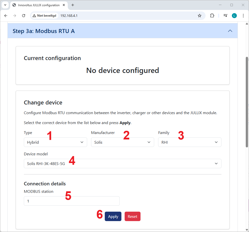 In de Jullix of Extender moet de omvormer communicatie nog geconfigureerd worden. Wanneer je een SOLIS hybride omvormer gebruikt, dan kies je in de modbus RTU configuratie bij Type: Hybrid (1) in de Manufacturer kies je Solis (2). Bij Family kies je in dit geval RHI (3) en vervolgens het juiste model bijvoorbeeld voor de Solis S5-EH1P3K-L of de RHI-3K-48ES-5G kies je: Solis RHI-3K-48ES-5G (4).