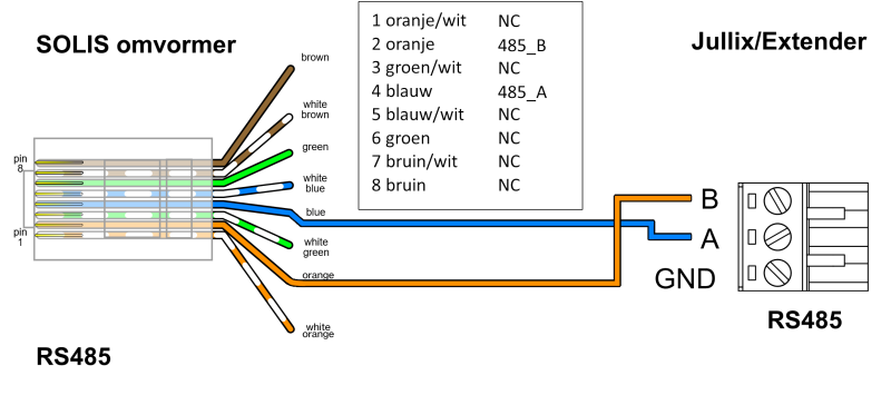 Op onderstaand schema zie je hoe de aansluitingen moeten gebeuren. Signaal Solis RJ45: pen 1 of 2 (oranje/wit of oranje) → A en pen 3 of 4 (groen/wit of blauw) → B.