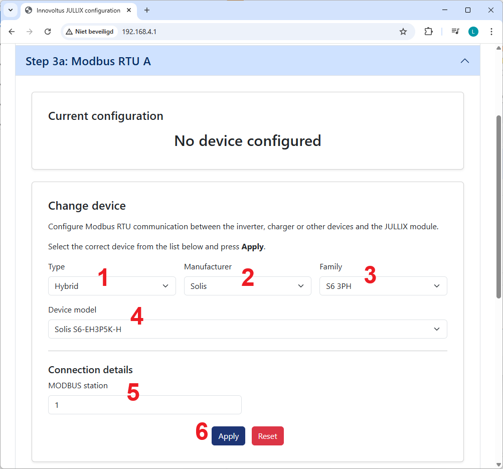 In de Jullix of Extender moet de omvormer communicatie nog geconfigureerd worden. Wanneer je een SOLIS hybride omvormer gebruikt, dan kies je in de modbus RTU configuratie bij Type: Hybrid (1) in de Manufacturer kies je Solis (2). Bij Family (3) S6 3PH , bij Device Model (4) kies je het juiste model bijvoorbeeld, Solis S6-EH3P12K-H.