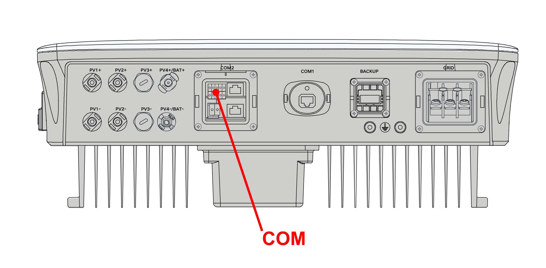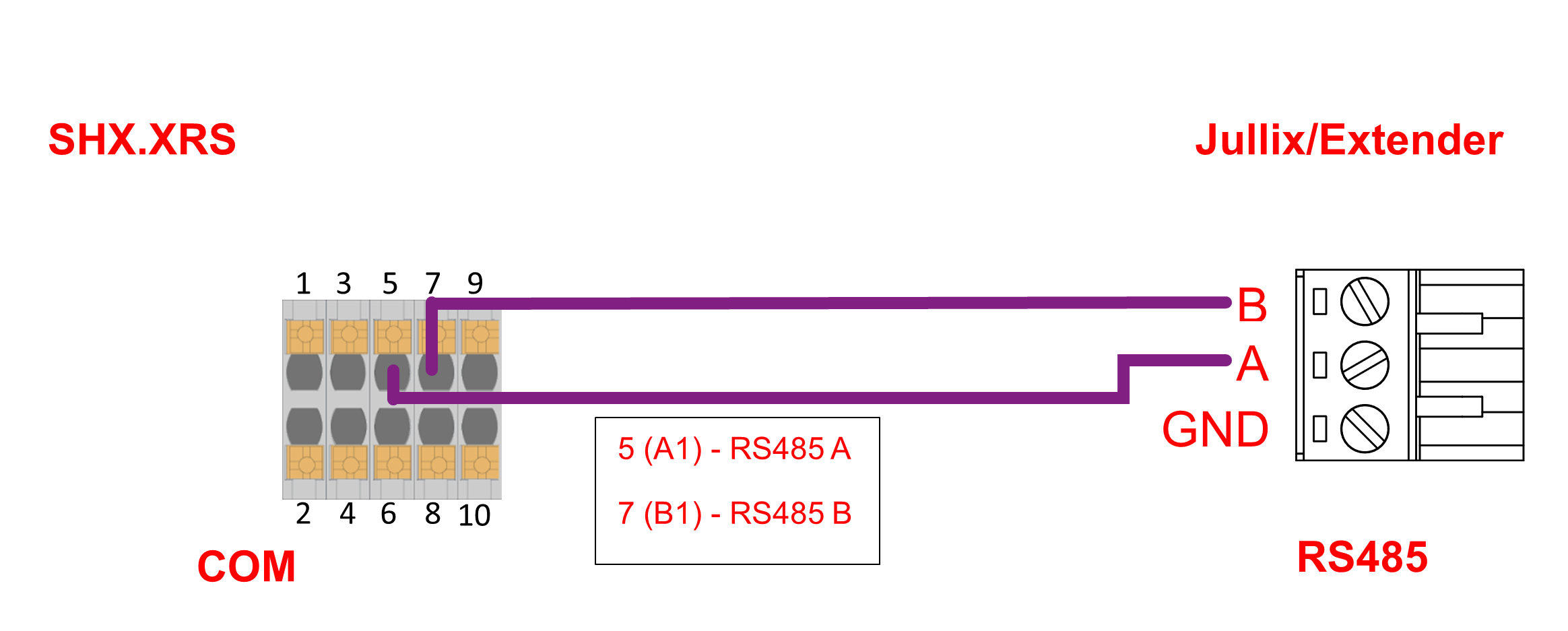 De Jullix of Extender wordt verbonden met de SHx.xRS via modbus/RS485 van de omvormer. Je vindt de RS485 aansluiting terug op de COM poort.