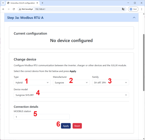In de Jullix of Extender moet de omvormer communicatie nog geconfigureerd worden.