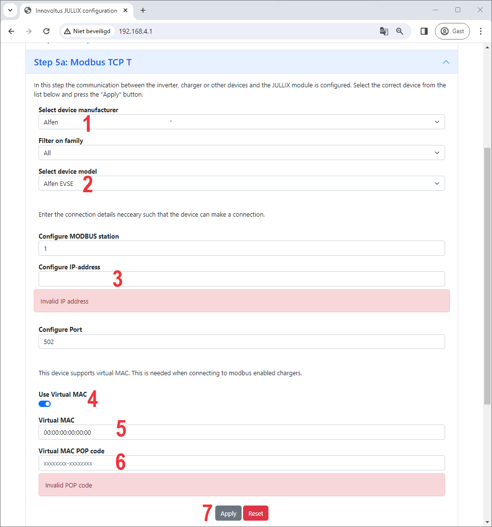 Vervolgens moet nog een virtueel MAC-adres ingesteld worden om de Alfen laadpaal te identificeren. Dit Virtuele MAC-ID is absoluut noodzakelijk om de laadpaal via de Jullix te kunnen besturen. Je schakelt Use Virtual MAC4 in en je vult het Virtual MAC5 met bijhorende Virtual MAC POP code6 in.