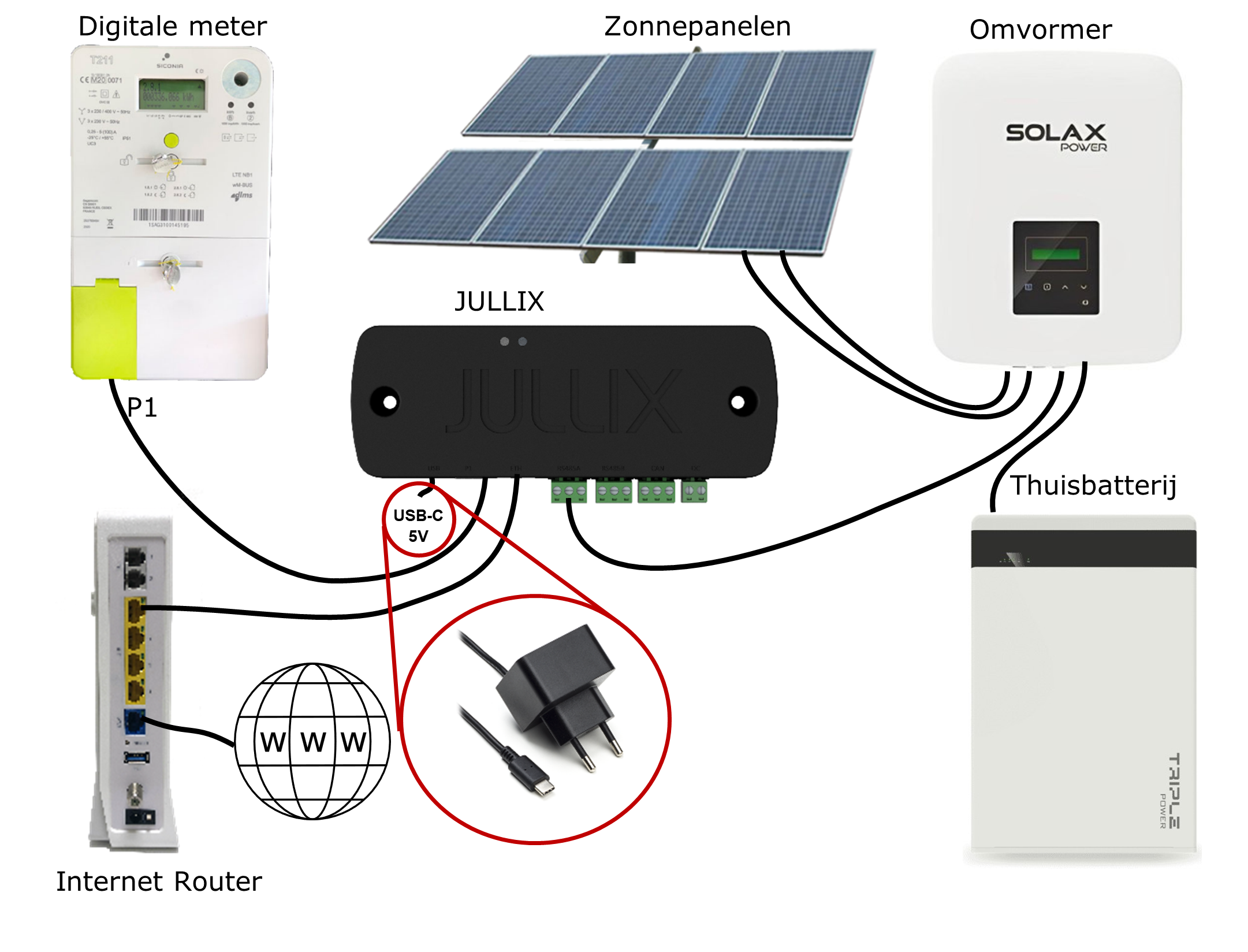 De Jullix zelf wordt gevoed via een aparte voeding (USB-C 5C), of eventueel vanuit de omvormer.\\